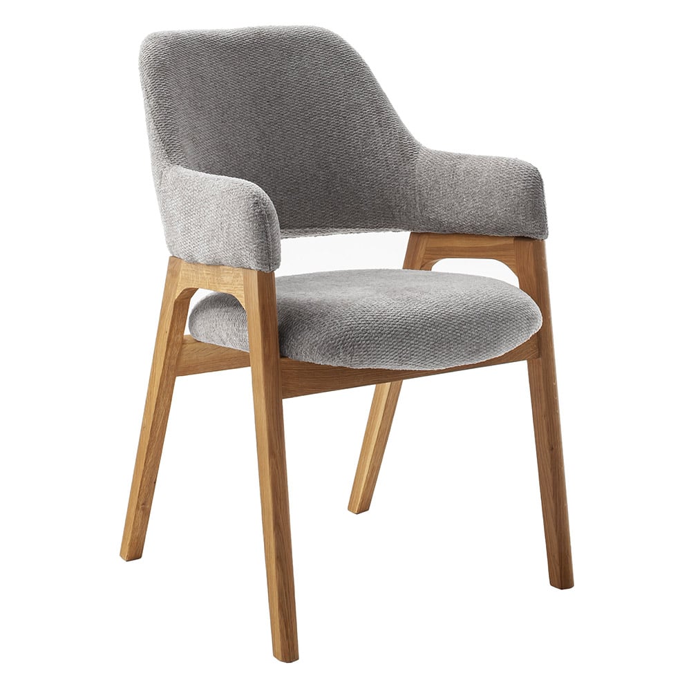 Der Armlehnstuhl Arbor (ca. 56x86x62 cm) aus geölter Wildeiche mit Etna grau Bezug verbindet elegantes Design, hohen Komfort und langlebige Qualität – perfekt für stilvolle Ess- und Wohnzimmer.