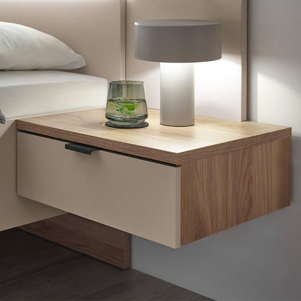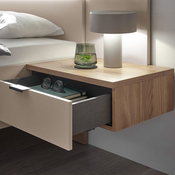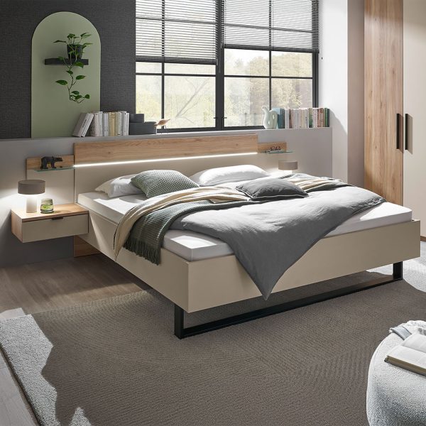 Der Mix aus natürlichem Holzton und matten, hellen Fronten verleiht der Bettanlage Daron weiß einen zeitgemäßen Look, der sich harmonisch in verschiedenste Wohnstile einfügt – von modern über skandinavisch bis hin zu Boho-inspiriert. Die schwebende Optik durch das schwarze Metallgestell unterstreicht das luftige, elegante Erscheinungsbild.