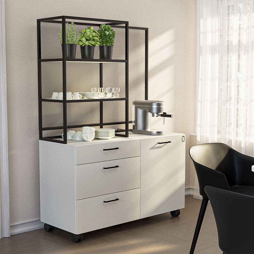 Der Cabinet Coffee Point Office ist die perfekte Ergänzung für moderne Büroumgebungen und sorgt für eine organisierte sowie ansprechende Kaffee- und Teestation. Der Korpus und die Front in weiß verleihen dem Möbelstück eine helle, freundliche Optik, während das Gestell in schwarz einen eleganten und zugleich robusten Kontrast schafft.