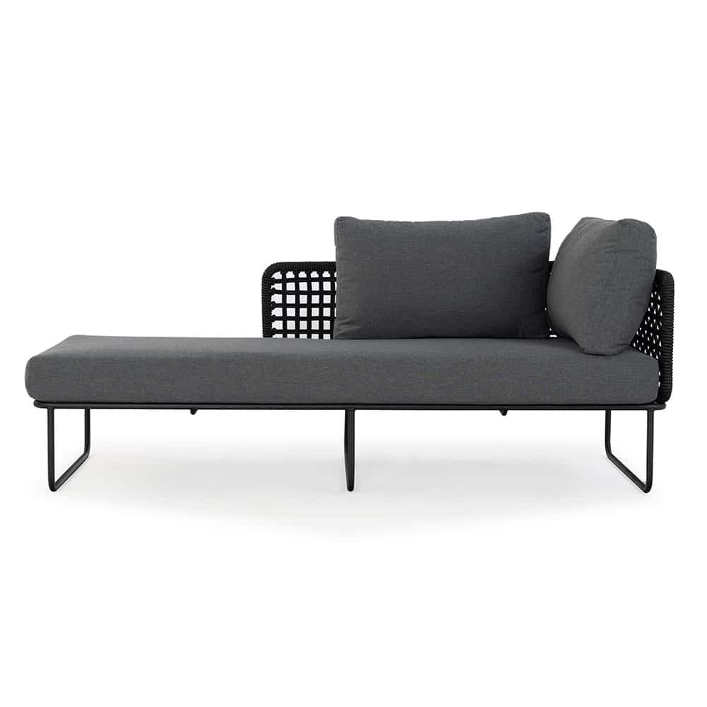 Das Daybed Timon (rechts) verbindet modernes Outdoor-Design mit komfortabler Funktion und hochwertigen Materialien. Die Rücken- und Seitenbereiche aus rundem Rope-Geflecht in Schwarz verleihen dem Möbelstück eine elegante, luftige Optik und sorgen gleichzeitig für Stabilität.