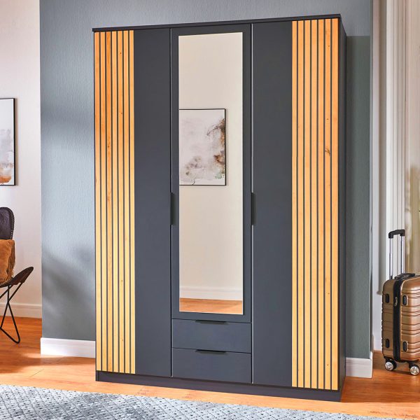 Der Drehtürenschrank Lübbenau vereint modernes Design in graphitfarbenem Dekor mit stilvollen Akustiklamellen in Artisan Eiche Nachbildung und bietet großzügigen Stauraum. Mit seinem integrierten Spiegel ist er zudem ein praktischer Begleiter im Alltag.