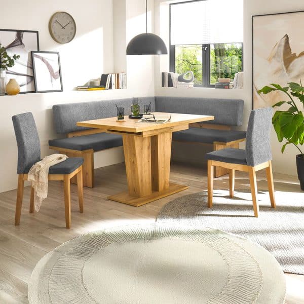 Der Bezug von Sitz und Rücken in Grau sorgt für eine moderne, vielseitig kombinierbare Optik, während die Elemente in Artisan Eiche Nachbildung eine warme, natürliche Note in Ihren Wohn- oder Essbereich bringen. Diese gelungene Materialkombination verleiht der Eckbank eine einladende Ausstrahlung.