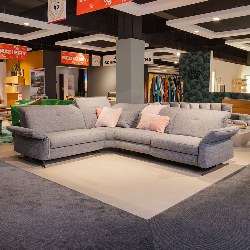 Die Eckgarnitur Vivique Grey Viviana bietet mit ca. 250×300 cm viel Platz und Komfort dank motorischen Sitzen und Sitzheizung.