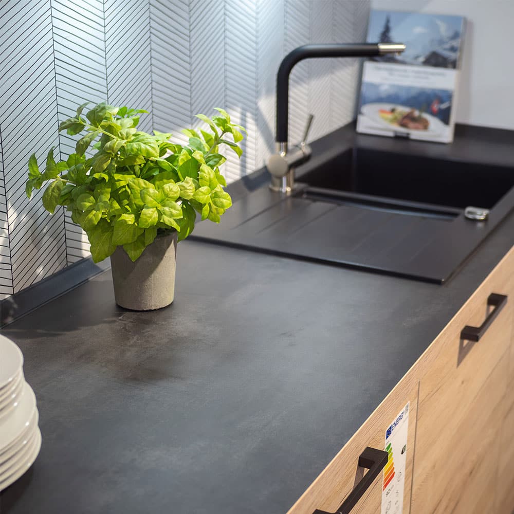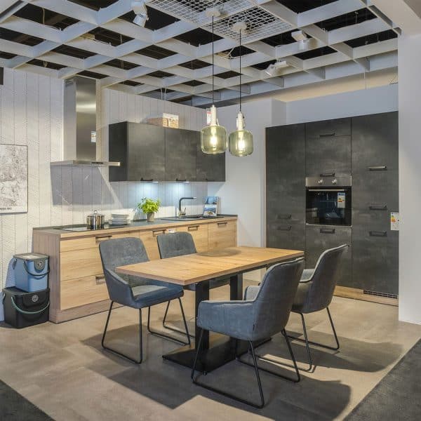Die Einbauküche 371 Riva kombiniert die warme Holzoptik Eiche San Remo mit einer markanten Arbeitsplatte in Schwarzbeton Nachbildung. Ein modernes Küchendesign mit natürlichem Charme – komplett wie ausgestellt.