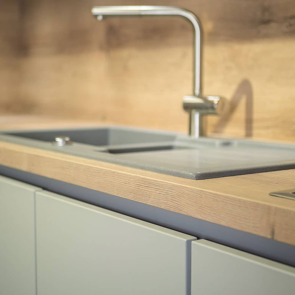 Die Einbauküche 406 Fashion überzeugt mit modernem Design in steingrau matt und einer stilvollen Terrazzo-Arbeitsplatte in grauer Nachbildung. Eine elegante Lösung für zeitgemäßes Wohnen.