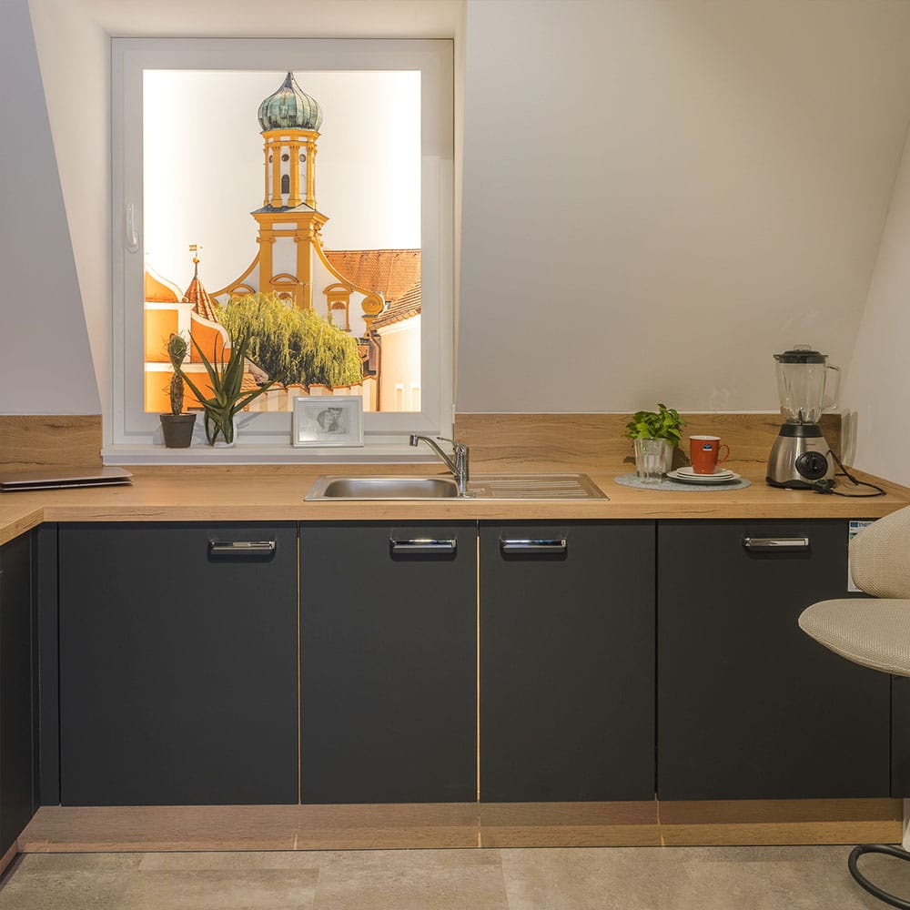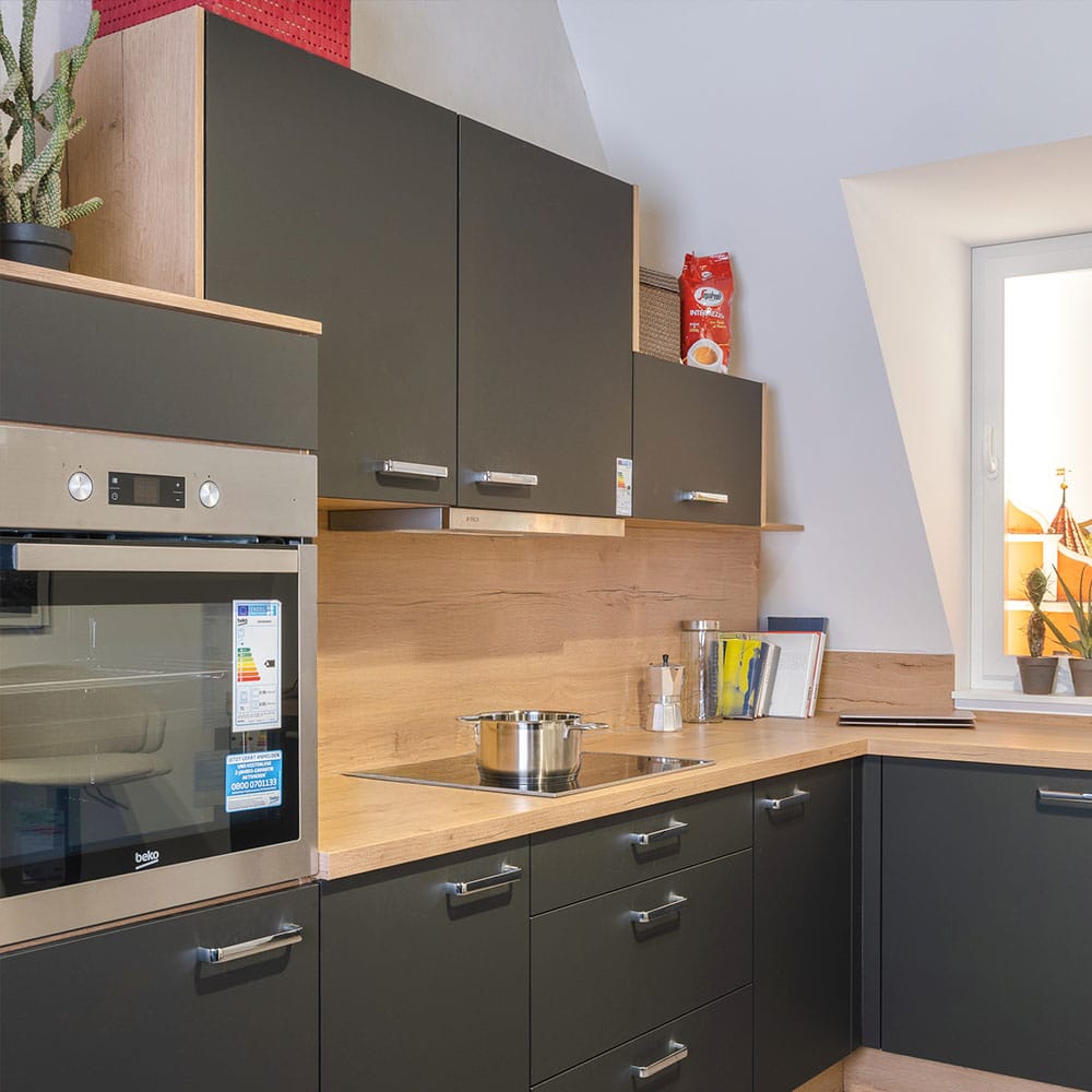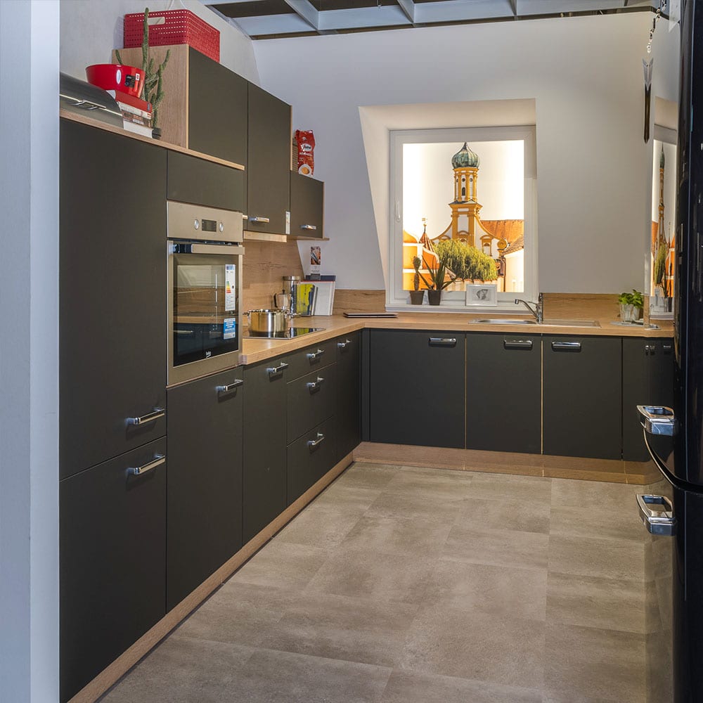 Die Einbauküche 945 besticht durch edles graphitschwarzes Samtmatt-Design und eine warme Arbeitsplatte in Eiche Sierra Nachbildung. Modern, elegant und individuell gestaltbar – ohne Geräte.