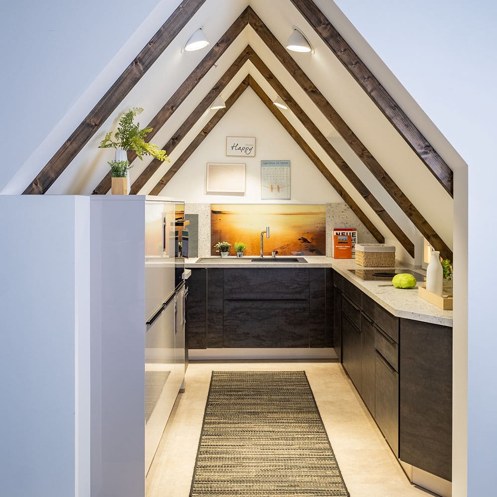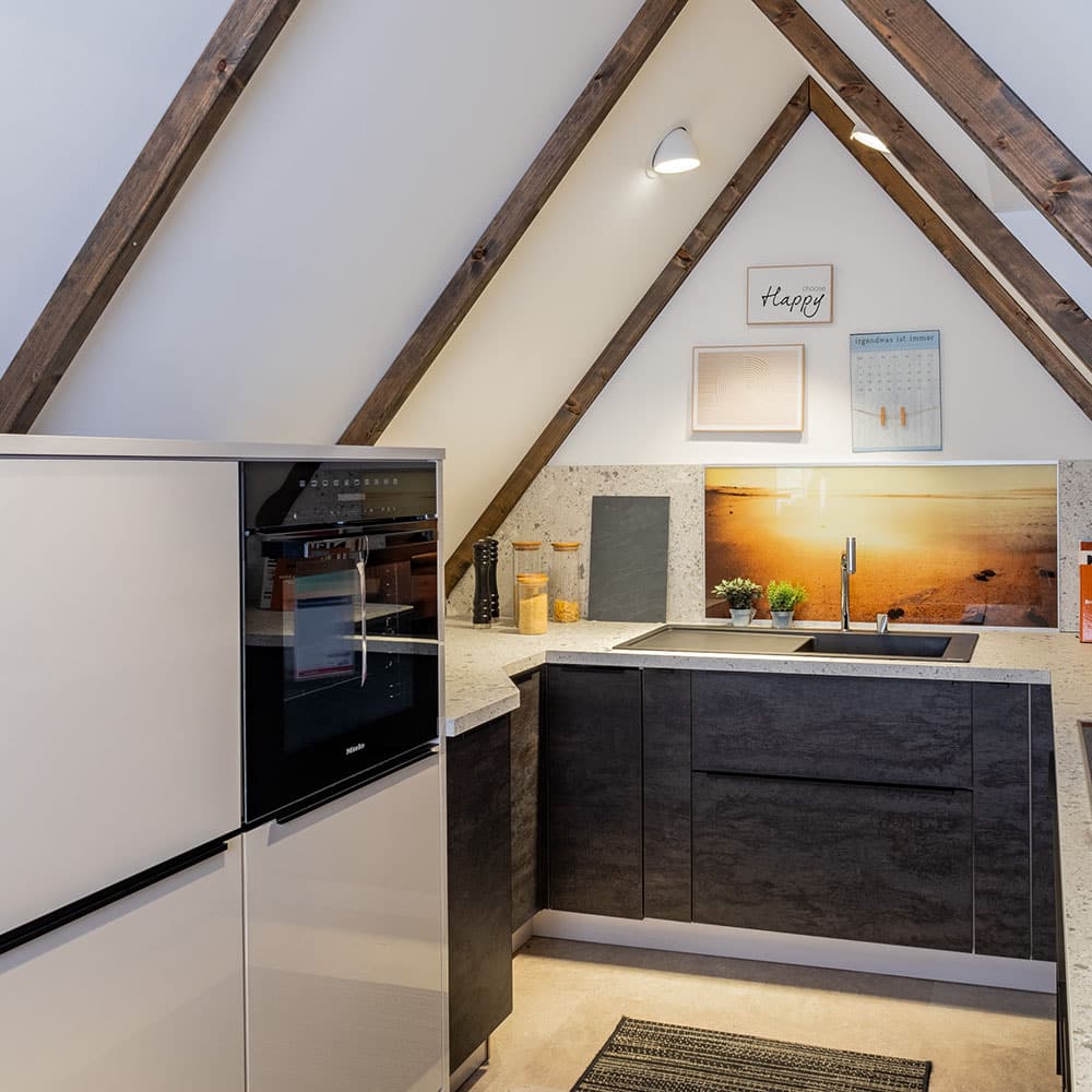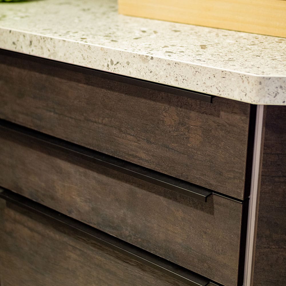 Die Einbauküche Artwood braun kombiniert markante Eiche-Optik mit moderner Technik. Helle Terrazzo-Arbeitsplatte und hochwertige Geräte inklusive.