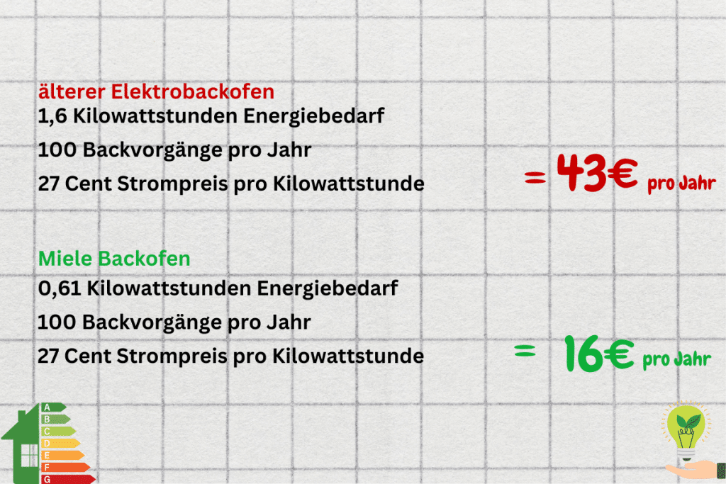 Im Gegensatz dazu haben moderne und energieeffiziente Küchengeräte einen niedrigeren Energiebedarf. Zum Beispiel verbraucht der Miele Backofen H 2601-1 B im Umluftmodus nicht mehr als 0,61 Kilowattstunden. Mit diesem Gerät würden bei 100 Backvorgängen nur etwas mehr als 16 Euro pro Jahr anfallen!
