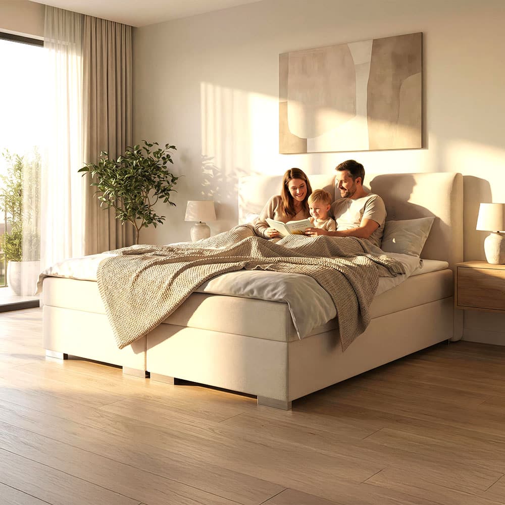 Das Familienbett Stellan beige bietet mit seiner großzügigen Liegefläche von ca. 240 × 200 cm viel Platz für gemeinsamen Schlafkomfort und gemütliche Familienmomente.