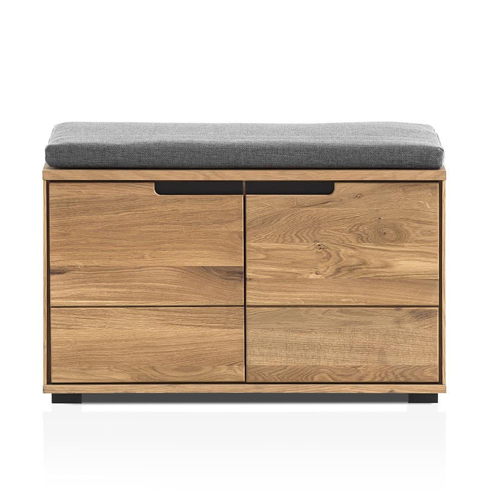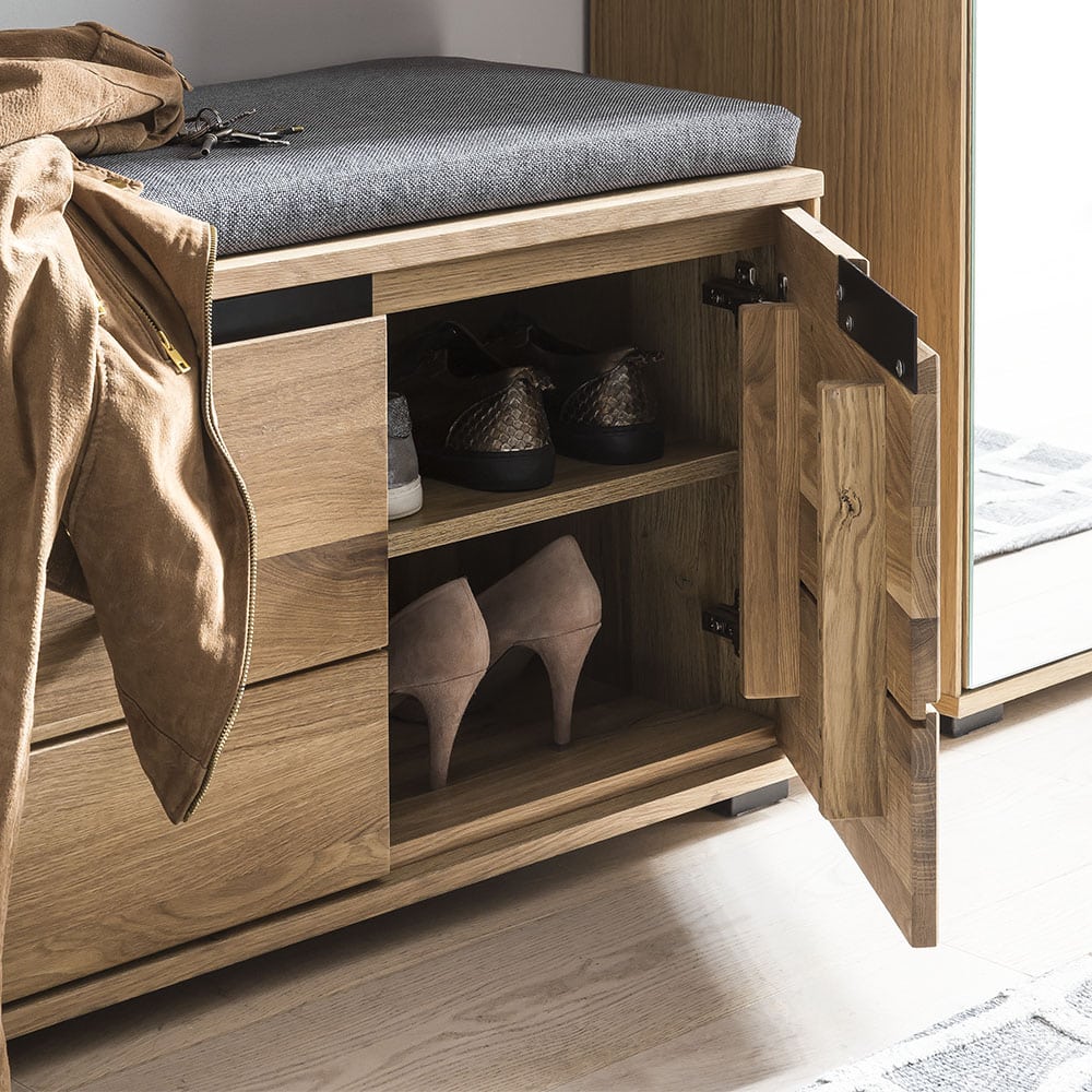 Die Garderobenbank Lorina Eiche teilmassiv geölt ist die perfekte Kombination aus Funktionalität und natürlichem Design. Hergestellt aus teilmassiver, geölter Eiche, verleiht sie Ihrem Eingangsbereich eine warme und elegante Atmosphäre. Mit einer Breite von ca. 80 cm bietet sie ausreichend Platz, um Schuhe bequem zu verstauen und sich beim An- oder Ausziehen bequem zu setzen. Das Sitzkissen in Grau sorgt für zusätzlichen Komfort und lädt zum Verweilen ein. Die Fronten bestehen aus massivem Eichenholz, während der Korpus furniert ist, was die Stabilität und Langlebigkeit der Bank gewährleistet. Zwei Türen mit Dämpfern und Griffmulden in Schwarz ermöglichen einen leisen und einfachen Zugriff auf den Stauraum. Die Dämpfer sorgen dafür, dass die Türen sanft schließen, was die Qualität und Wertigkeit des Möbels unterstreicht. Die natürliche Holzoptik passt hervorragend zu verschiedenen Einrichtungsstilen, von modern bis rustikal. Die hochwertige Verarbeitung und die Verwendung nachhaltiger Materialien machen die Garderobenbank Lorina Eiche teilmassiv geölt zu einem langlebigen Begleiter im Alltag. Ob im Flur, Eingangsbereich oder in einem Gästezimmer – diese Bank vereint praktischen Nutzen mit stilvollem Design und schafft eine einladende Atmosphäre.