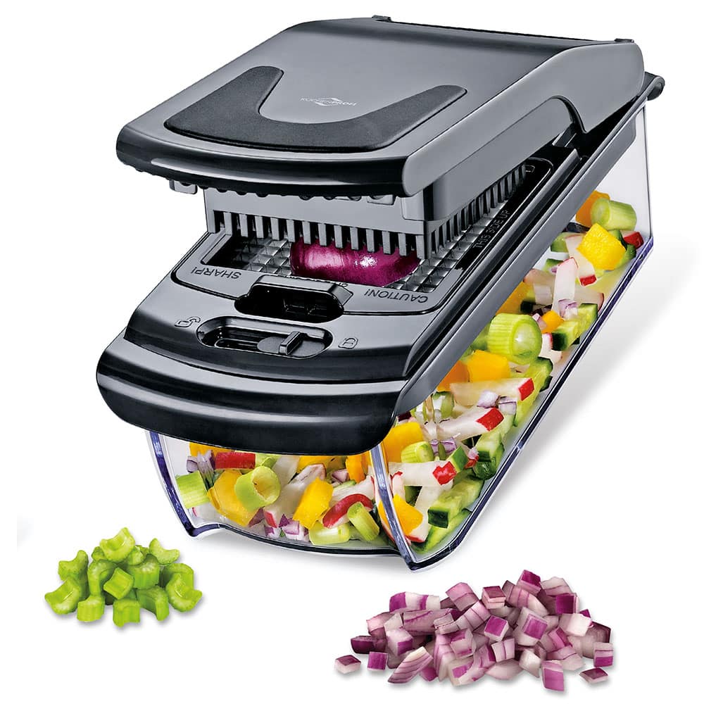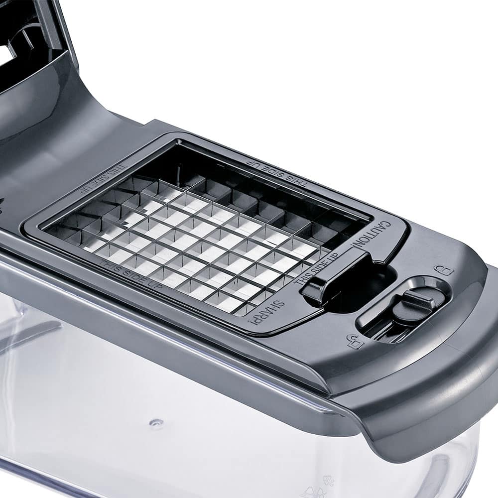 Der Gemüsewürfler Compacto schwarz vereinfacht die Vorbereitung verschiedenster Zutaten und sorgt für präzise, gleichmäßige Ergebnisse. Ausgestattet mit zwei Würfeleinsätzen ermöglicht er das Zuschneiden in unterschiedlichen Würfelgrößen – ideal für Salate, Suppen, Pfannengerichte oder Saucen. Der Gemüsewürfler Compacto schwarz ist ein zuverlässiges Tool für alle, die Wert auf sauberes Arbeiten, gleichmäßige Schnittergebnisse und effiziente Vorbereitung legen.