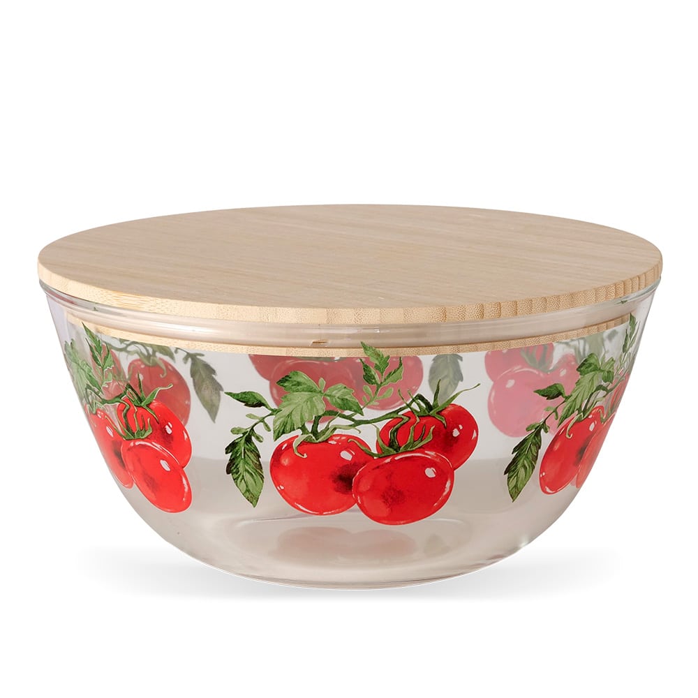 Die Glasschale Rosso mit Deckel verbindet elegantes, transparentes Glas mit einem naturfarbenen Bambusdeckel und einem roten Akzent. Mit einem Fassungsvermögen von ca. 2700 ml und den Maßen D/H ca. 23 × 11 cm ist sie ideal zum stilvollen Aufbewahren und Servieren.