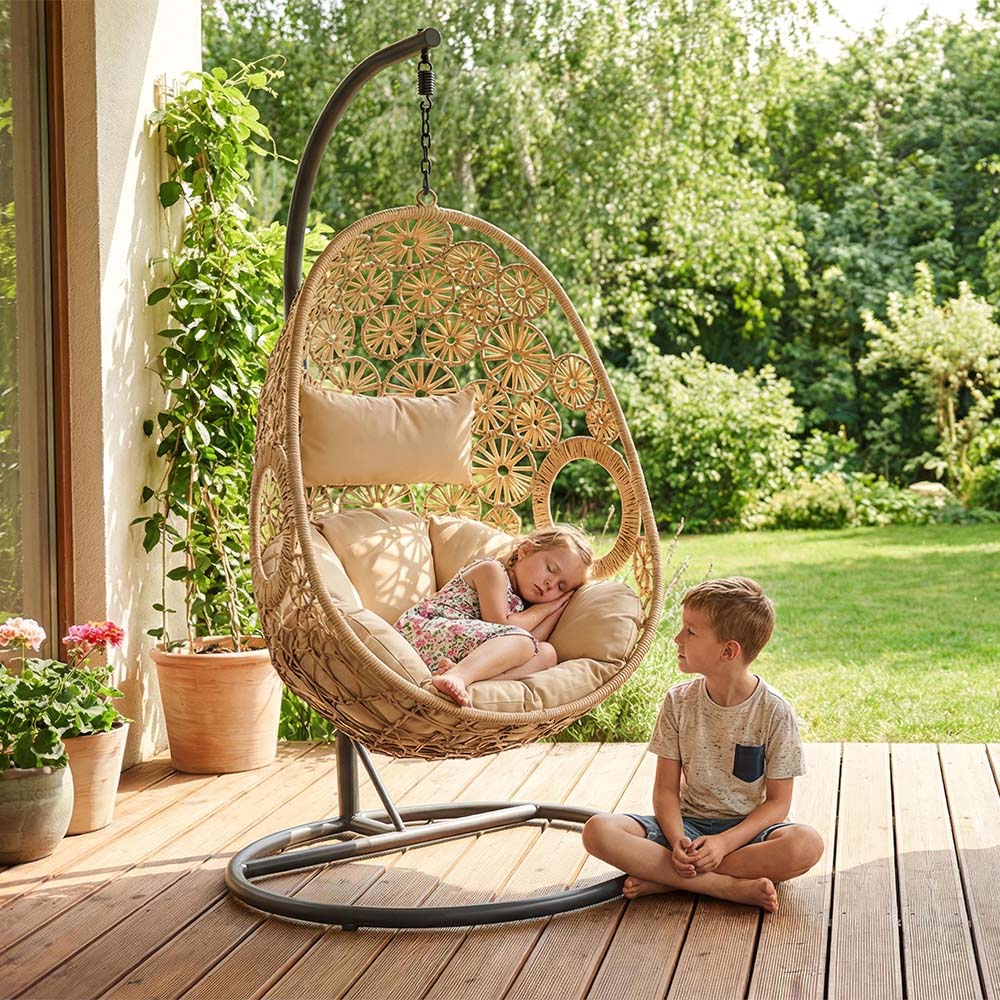 Der Hängesessel Funda ist ein gemütlicher Blickfang für Garten, Balkon oder Terrasse und schafft eine entspannte Wohlfühlatmosphäre im Outdoorbereich.