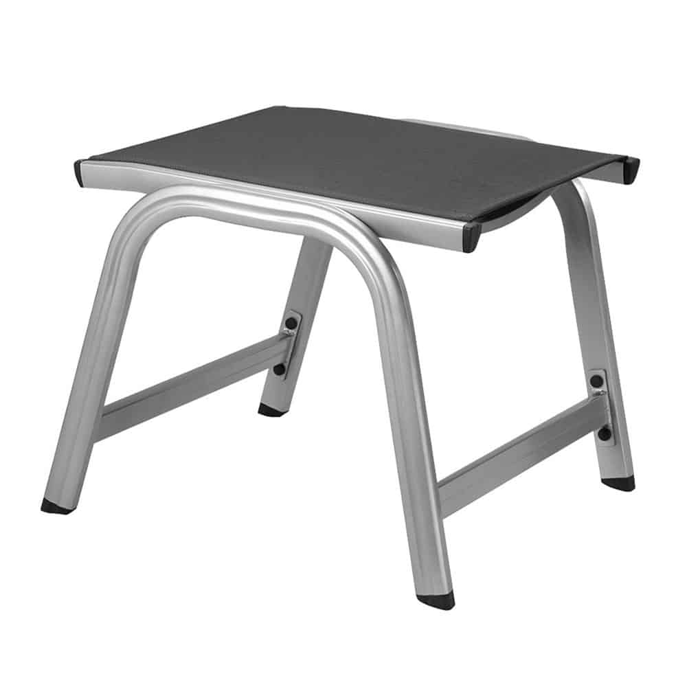 Der Hocker Basic Plus mit anthrazitfarbenem Outdoor-Gewebe und silberfarbenem Aluminiumgestell ist eine praktische Ergänzung für Garten- und Terrassenmöbel.