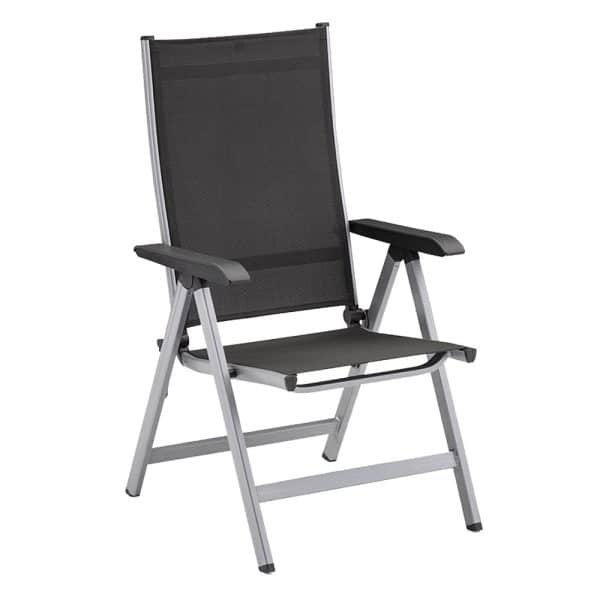 Der Klappsessel Basic Plus mit anthrazitfarbenem Outdoor-Gewebe und silberfarbenem Aluminiumgestell bietet komfortables Sitzen im Garten und lässt sich platzsparend zusammenklappen.