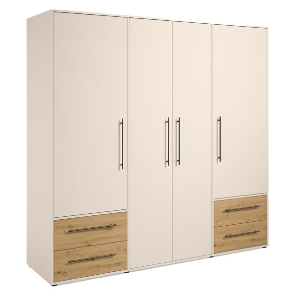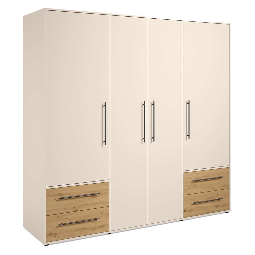 Der 4-türige Kleiderschrank Montrell in Eiche Beige kombiniert natürliche Optik mit schwarzen Griffen im modernen Kontrast. Großzügiger Stauraum mit Schubladen, Einlegeböden und Kleiderstange sorgt für perfekte Ordnung.