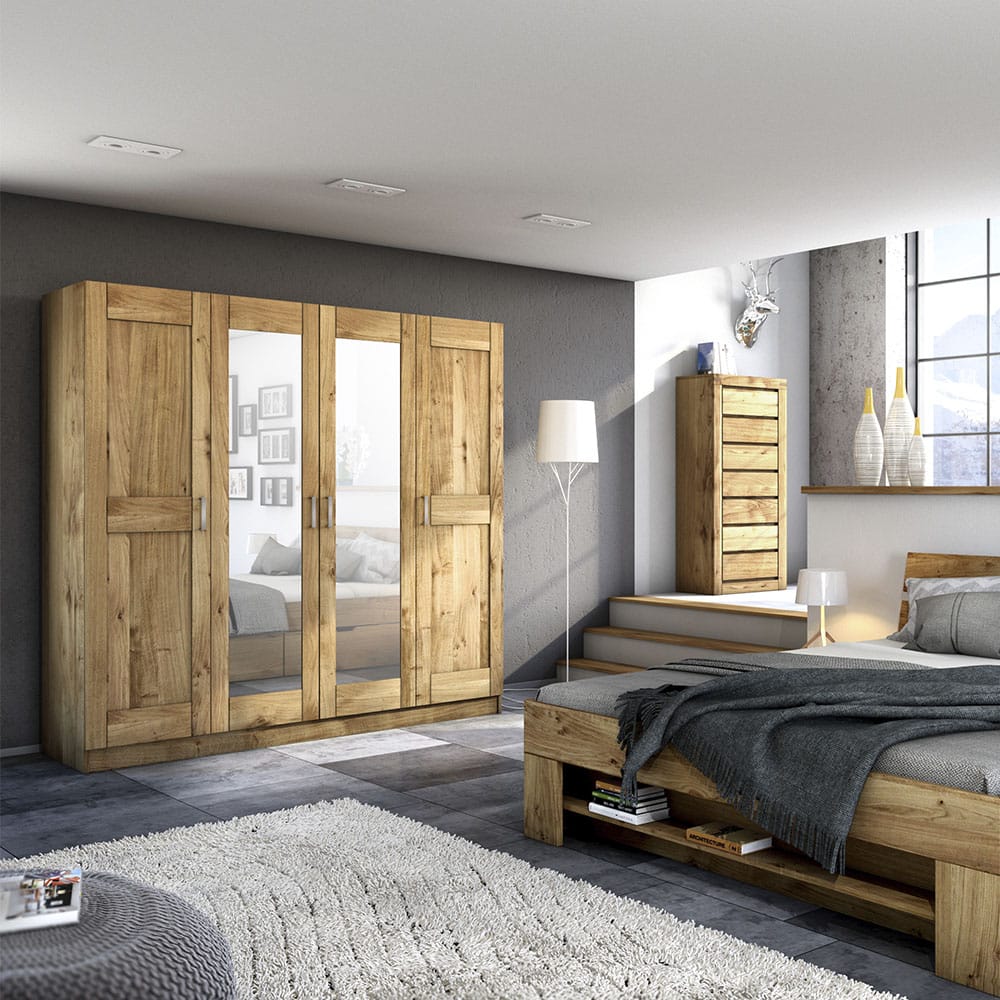 Der 4-türige Kleiderschrank Tambach aus geölter Wildeiche überzeugt mit massiven Lamellenfronten und zwei integrierten Spiegeln. Innen bieten 4 Fächer, ein Hutboden und eine Kleiderstange viel Stauraum für Ihre Kleidung.