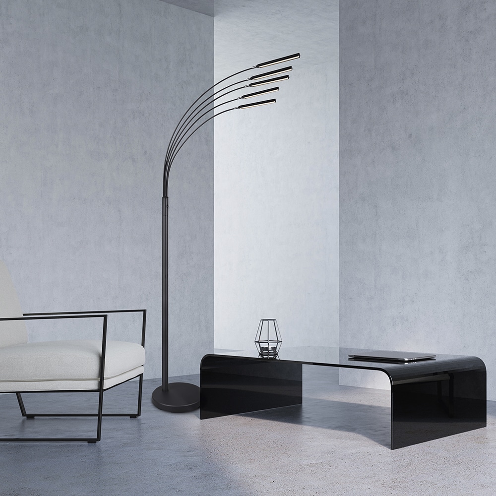 Die LED-Stehleuchte „Reed“ 5-flammig überzeugt durch modernes, gebogenes Design in Schwarz oder Nickel‑Matt, fünf dimmbare LED‑Lichtquellen (insg. ca. 1.750 lm bei 3 200 K) und Memory‑Funktion für angenehmes Raumlicht (ca. 195 cm hoch, IP20).