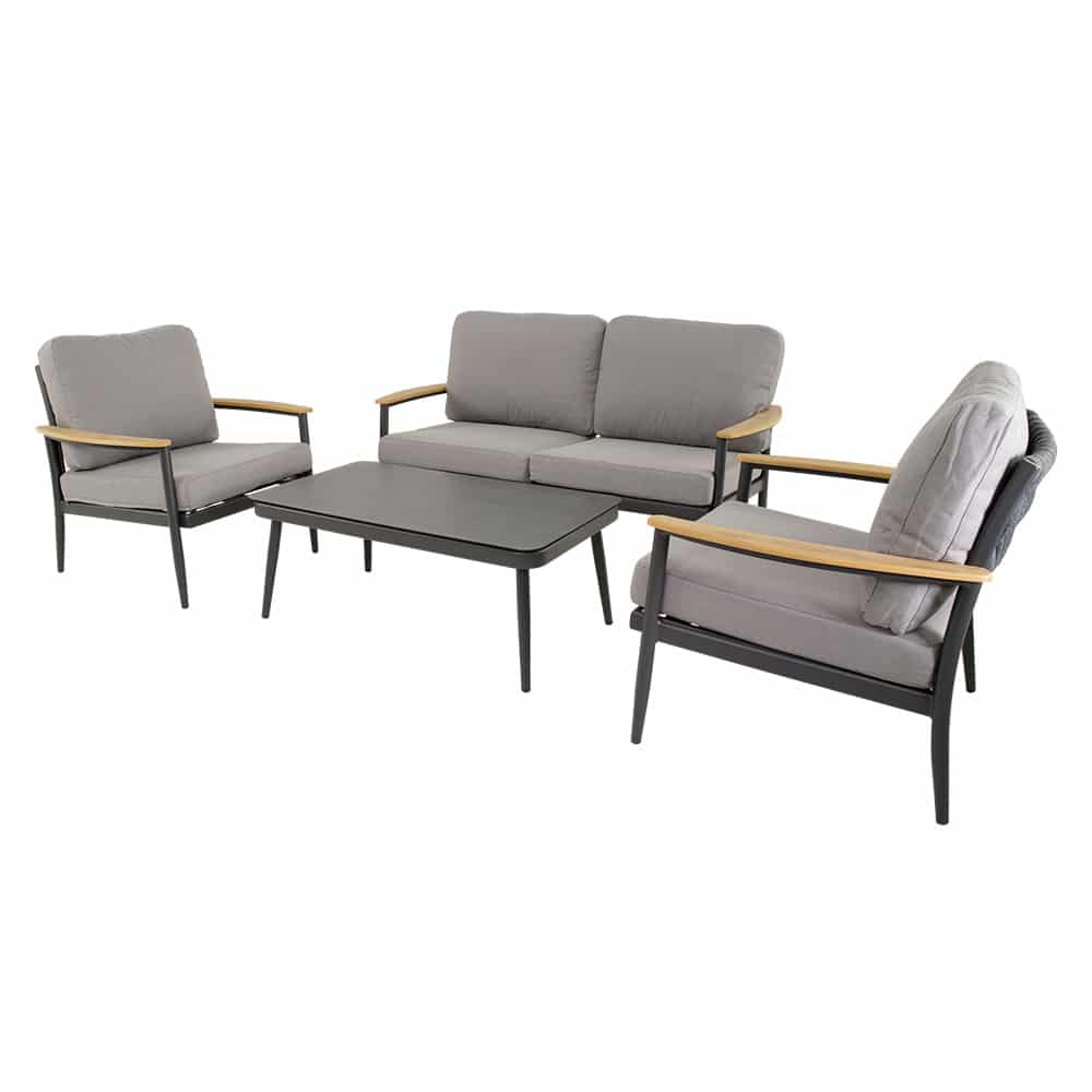 Mit einer Armlehnenhöhe von ca. 57 cm bieten Sessel und Sofa eine komfortable Sitzposition. Die Kombination aus klaren Linien und neutralen Farben macht das Set vielseitig kombinierbar und zu einem stilvollen Mittelpunkt im Outdoorbereich.