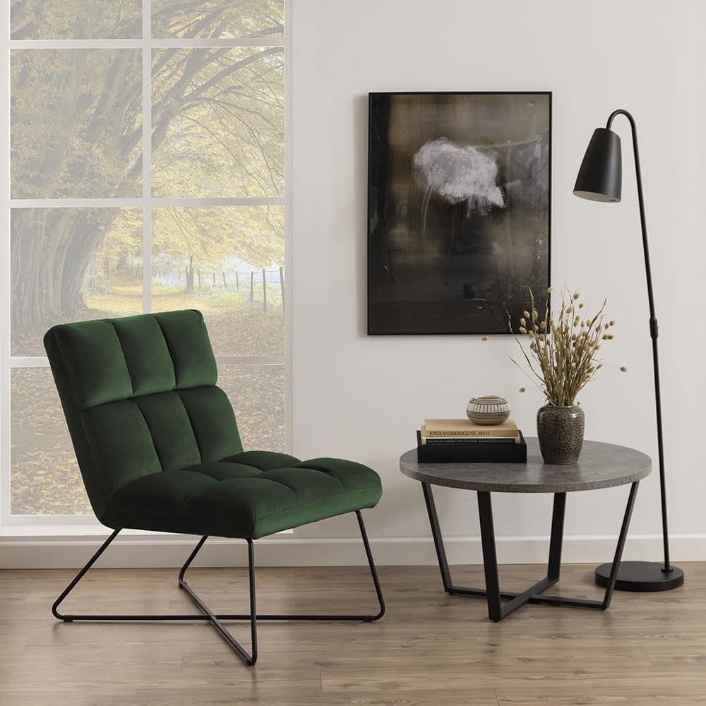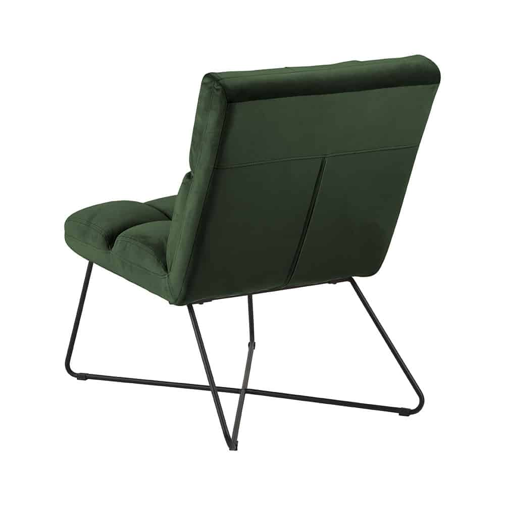 Loungestuhl Aabid mit waldgrünem Stoffbezug, legerer Polsterung und markanten Ziernähten. Das matt schwarze, rau pulverbeschichtete Stahlgestell sorgt für Stabilität. Inklusive Reißverschluss für pflegeleichte Handhabung.