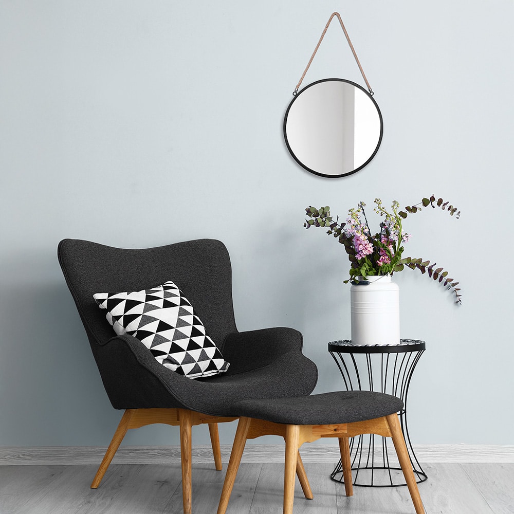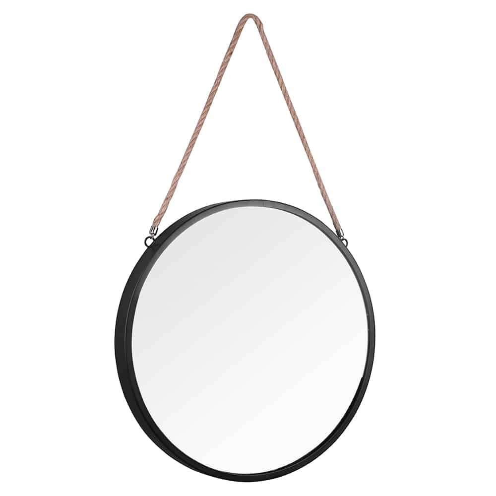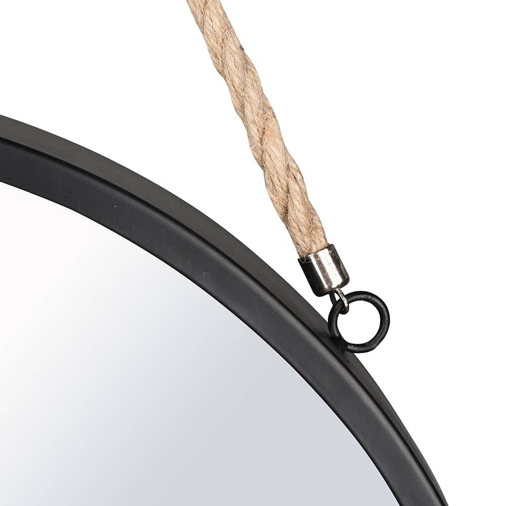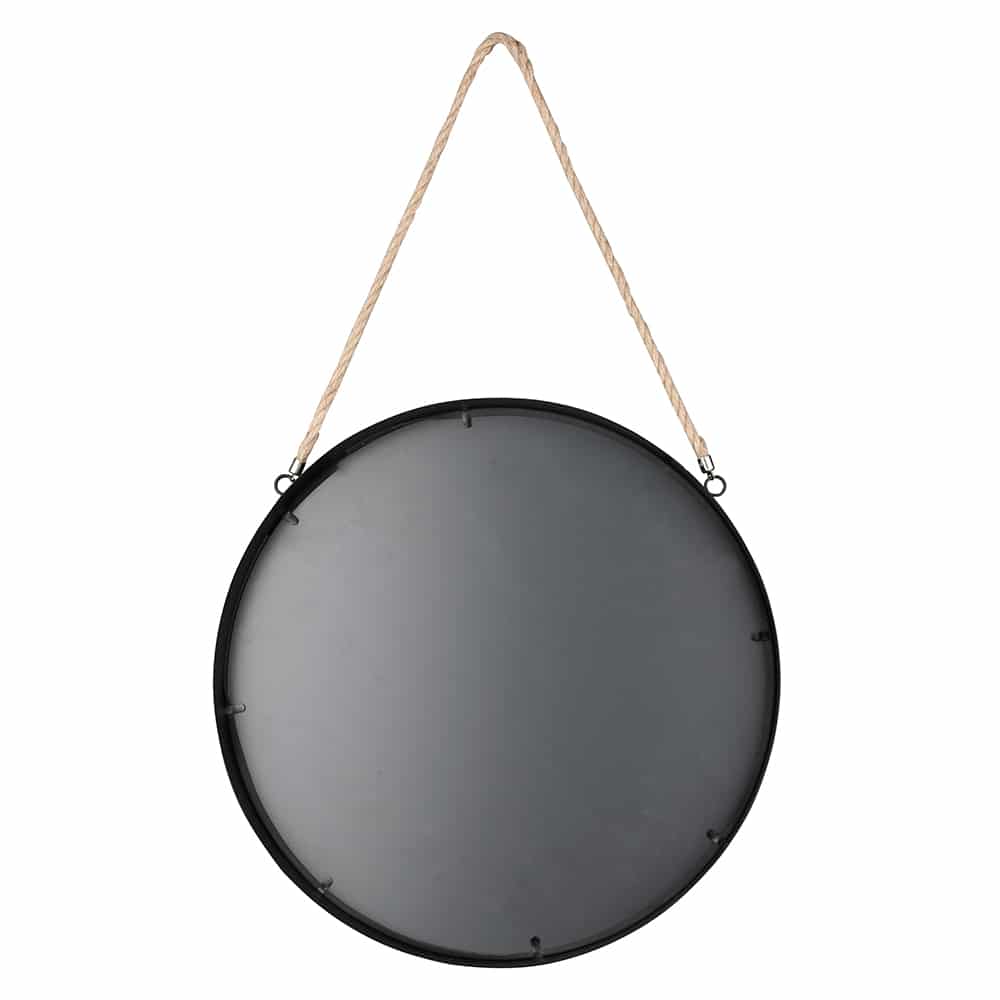 Der schwarze Metallspiegel Nina mit Seil, ca. 40 cm Durchmesser, ist ein stilvoller und praktischer Dekorationsartikel für jeden Raum.