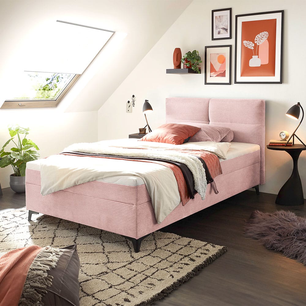 Das Polsterbett Ava rosa verbindet stilvolle Optik mit durchdachtem Komfort. Der rosafarbene Stoffbezug verleiht dem Bett eine elegante und wohnliche Ausstrahlung, während das stabile Holzgestell für zuverlässige Stabilität sorgt. Ausgestattet mit einer 4-Gang-Bonell-Federkernmatratze im Härtegrad 2 und einem zusätzlichen Schaumstoff-Topper bietet das Polsterbett angenehmen Liegekomfort. Praktisch ist der integrierte Bettkasten, der zusätzlichen Stauraum schafft. Schwarze Kunststofffüße runden das Gesamtbild modern ab. Mit einer Belastbarkeit von bis zu 120 kg ist das dieses Produkt ideal für komfortbewusstes Wohnen im Alltag.