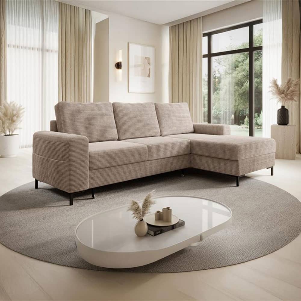 Die Polsterecke Lilana beige ist die ideale Wahl für alle, die Komfort und modernes Design miteinander verbinden möchten. Die Polsterecke Lilana beige besticht durch ihren hochwertigen Stoffbezug in Beige, der der Garnitur eine zeitlose, freundliche Ausstrahlung verleiht und sich vielseitig in unterschiedliche Wohnstile integrieren lässt. Schwarze Metallfüße setzen einen eleganten Kontrast und unterstreichen den modernen Charakter.