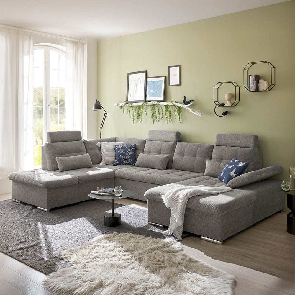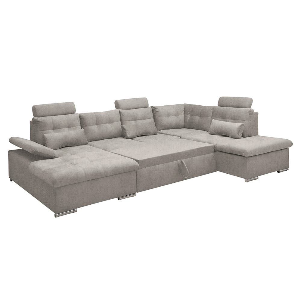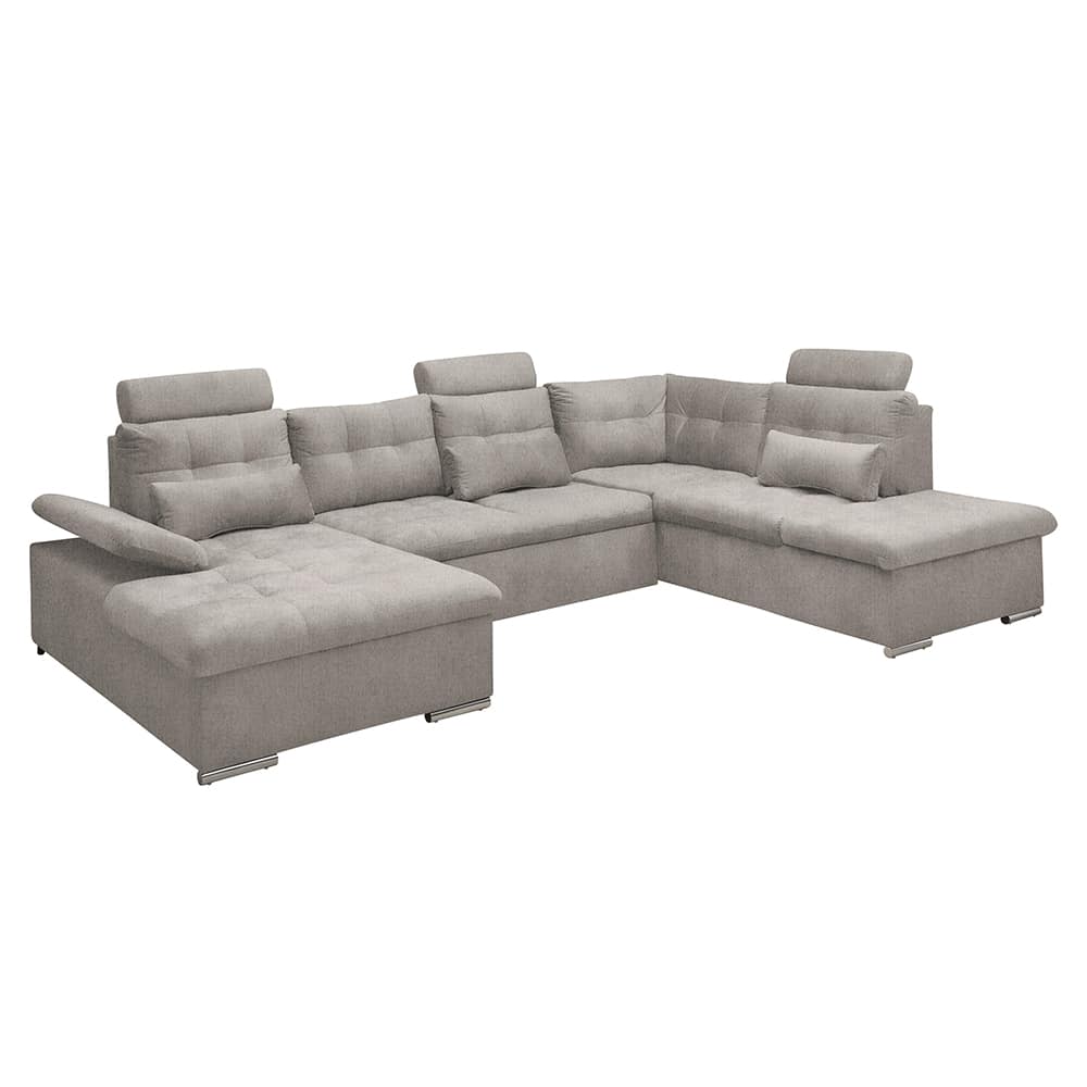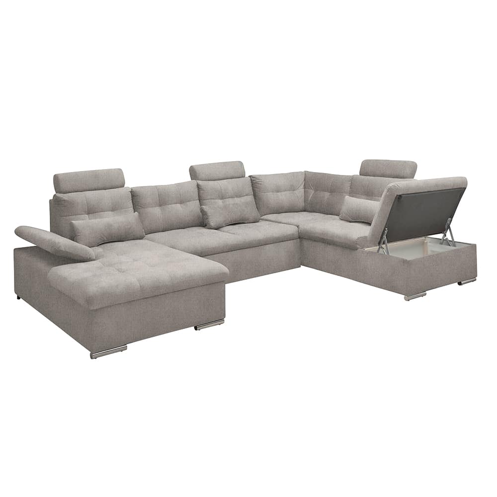 Polstergarnitur Manjola – Stoffbezug in Taupe, mit Armteil- und Kopfstützenverstellung, Schlaffunktion & Bettkasten.