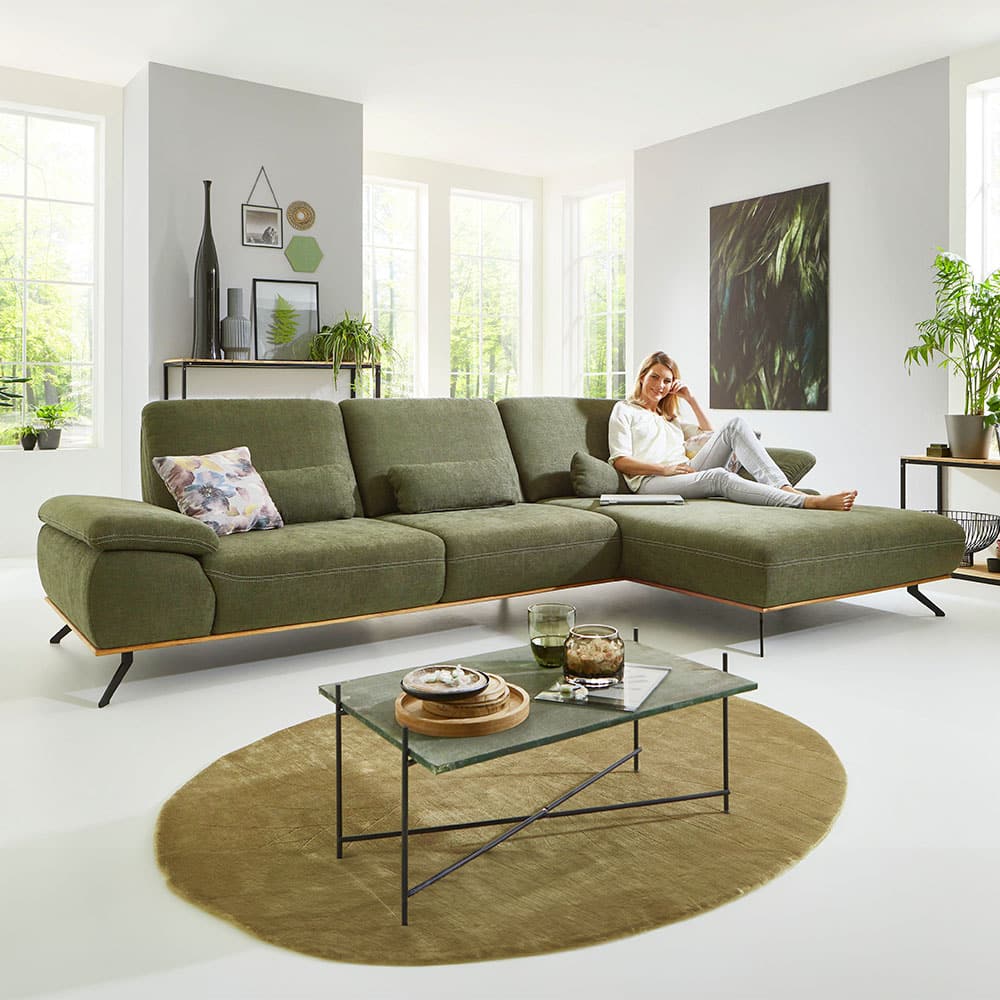 Die Polstergarnitur moos Stoff Savena verbindet modernes Design mit einer natürlichen, wohnlichen Farbwelt. Der Stoffbezug „Cyber moos“ (PG D) setzt einen stilvollen Akzent und bringt Frische sowie Ruhe in den Wohnraum. Die Polstergarnitur moos Stoff besteht aus einem 3-Sitzer mit Armteil links und einem Canapé mit Armteil rechts – ideal zum Sitzen, Loungen oder entspannten Beinehochlegen. Für angenehmen Komfort sorgt die Sitzqualität aus Kaltschaum, die langlebig, formstabil und bequem ist. Die legere Polsterung unterstreicht den entspannten Charakter des Sofas und lädt zum Verweilen ein. Schlanke Winkelfüße aus schwarzem Metall geben der Garnitur eine moderne Leichtigkeit und sorgen gleichzeitig für einen stabilen Stand. Maße (ca.): B/H/T 322 × 89 × 187 cm. Eine stilvolle Polsterlösung für alle, die modernes Wohnen mit natürlicher Farbgebung und hohem Komfort kombinieren möchten. Polstergarnitur moos Stoff überzeugt durch hohe Qualität und zeitloses Design.