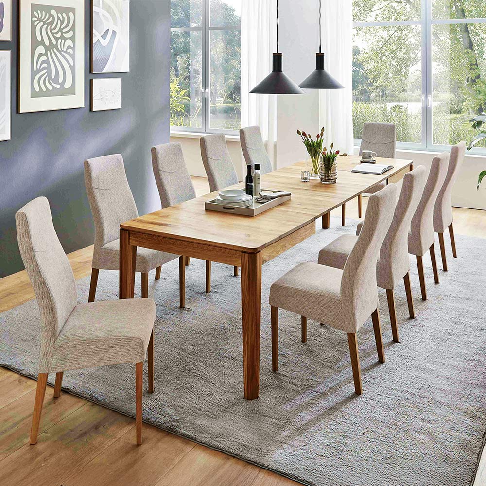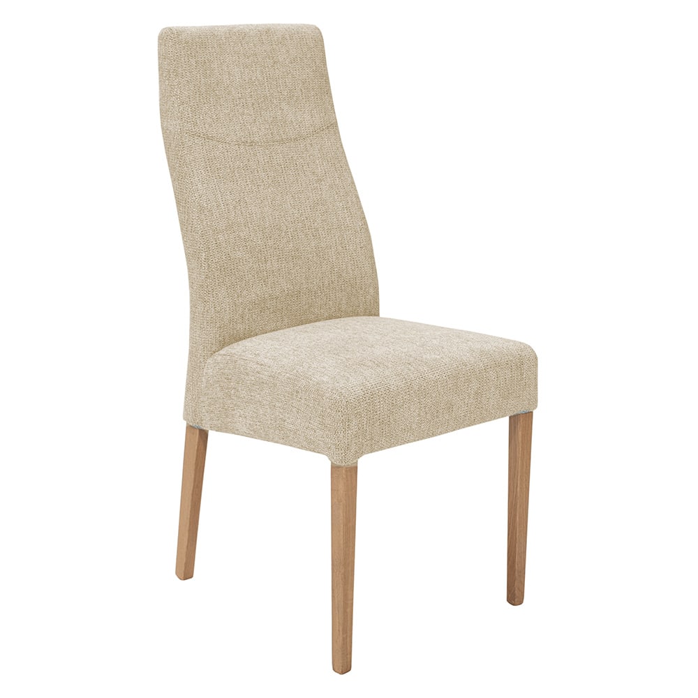 Eleganter Polsterstuhl Bezug silber mit massivem Eichegestell natur lackiert. Modernes Design und hoher Sitzkomfort für Esszimmer & Wohnbereich.