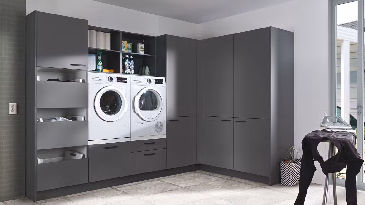 Waschmaschinenschränke und Geräteumbauten integrieren Waschmaschine und Trockner platzsparend und sorgen für ein harmonisches Gesamtbild. Ergänzt durch geräumige Hoch- und Unterschränke für Waschmittel, Reinigungsutensilien und Wäschekörbe bleibt der Raum stets ordentlich. Eine stabile Arbeitsplatte über den Geräten bietet zusätzliche Ablagefläche, ideal zum Sortieren und Zusammenlegen der Wäsche. Regale und mobile Rollcontainer schaffen weiteren Stauraum und halten wichtige Utensilien stets griffbereit.