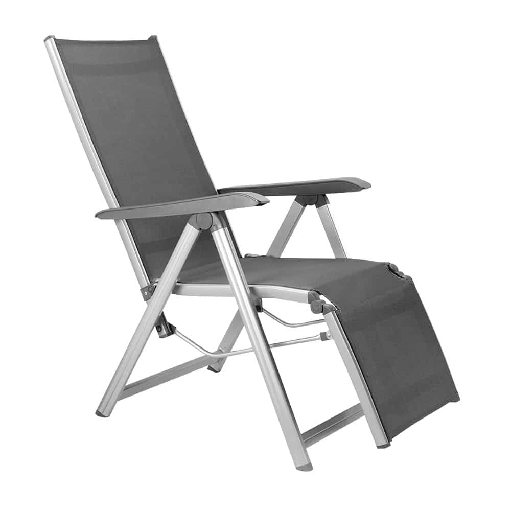 Der Relaxsessel Basic Plus mit anthrazitfarbenem Gewebebezug und silberfarbenem Aluminiumgestell bietet komfortables Sitzen und Entspannen im Garten oder auf der Terrasse.