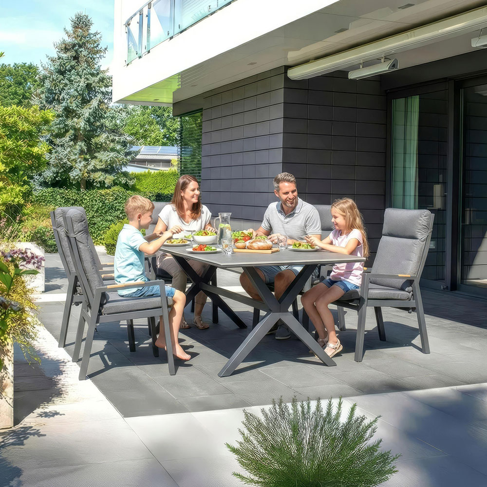 Das stabile Gestell aus Aluminium sorgt für eine leichte, dennoch robuste Konstruktion und unterstreicht die moderne Optik des Sessels. Die Armlehnen aus Teakholz setzen einen natürlichen Akzent und bieten zusätzlichen Komfort.