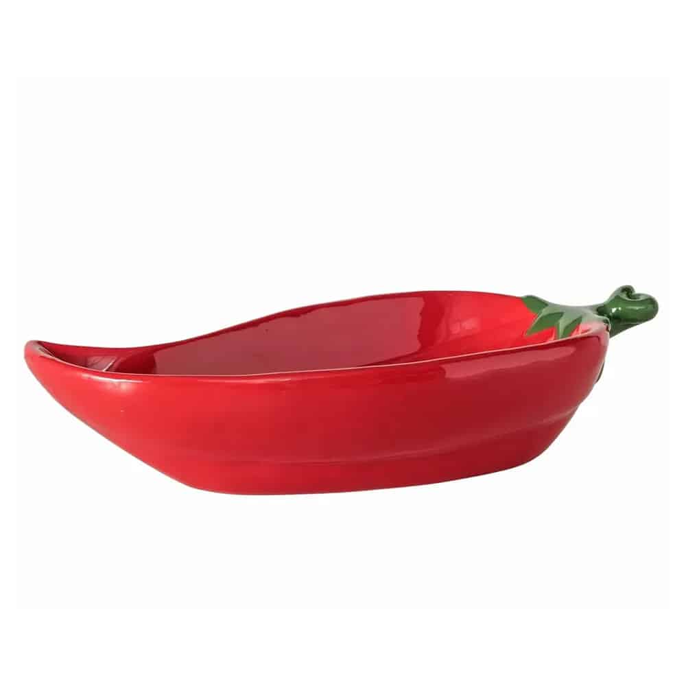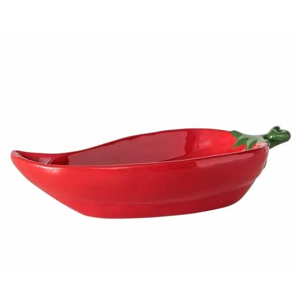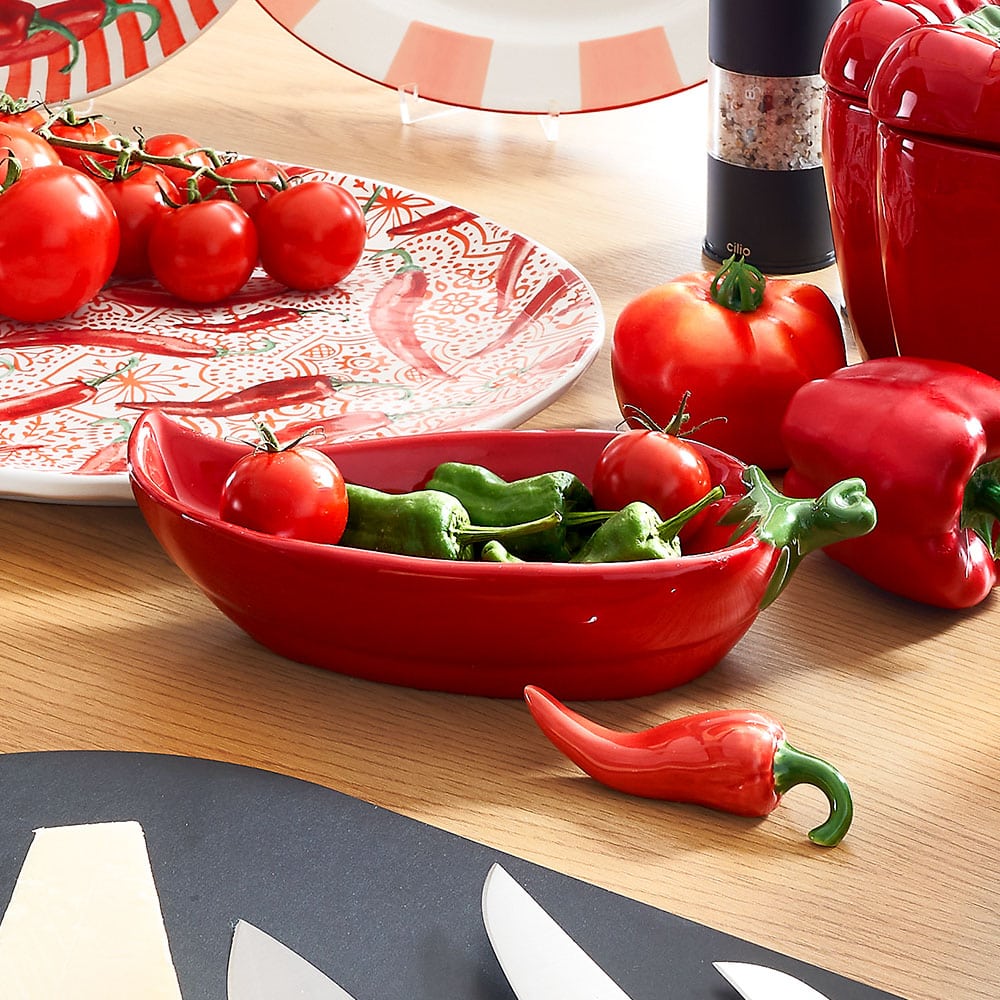 Die Schale Peperoni aus rotem Porzellan in dekorativer Peperoni-Form ist ideal zum stilvollen Servieren von Snacks, Dips oder kleinen Speisen.