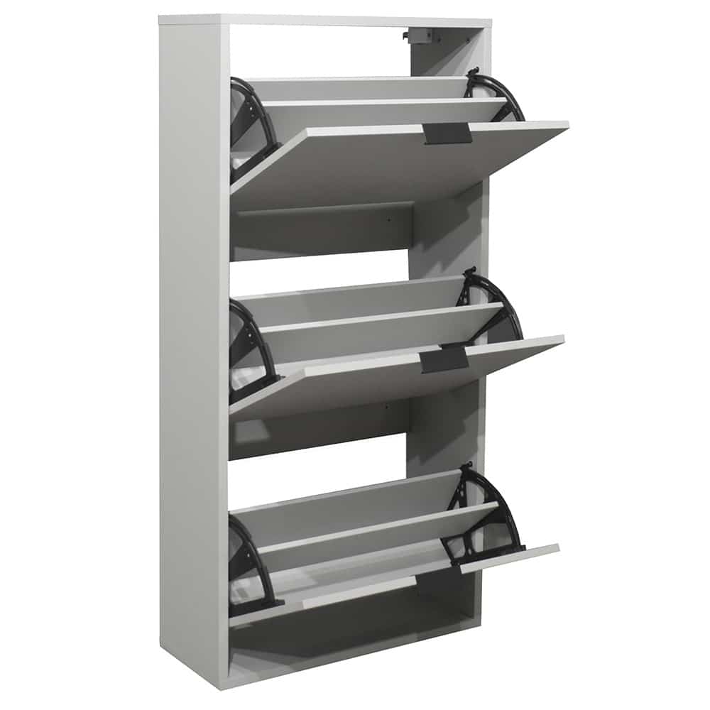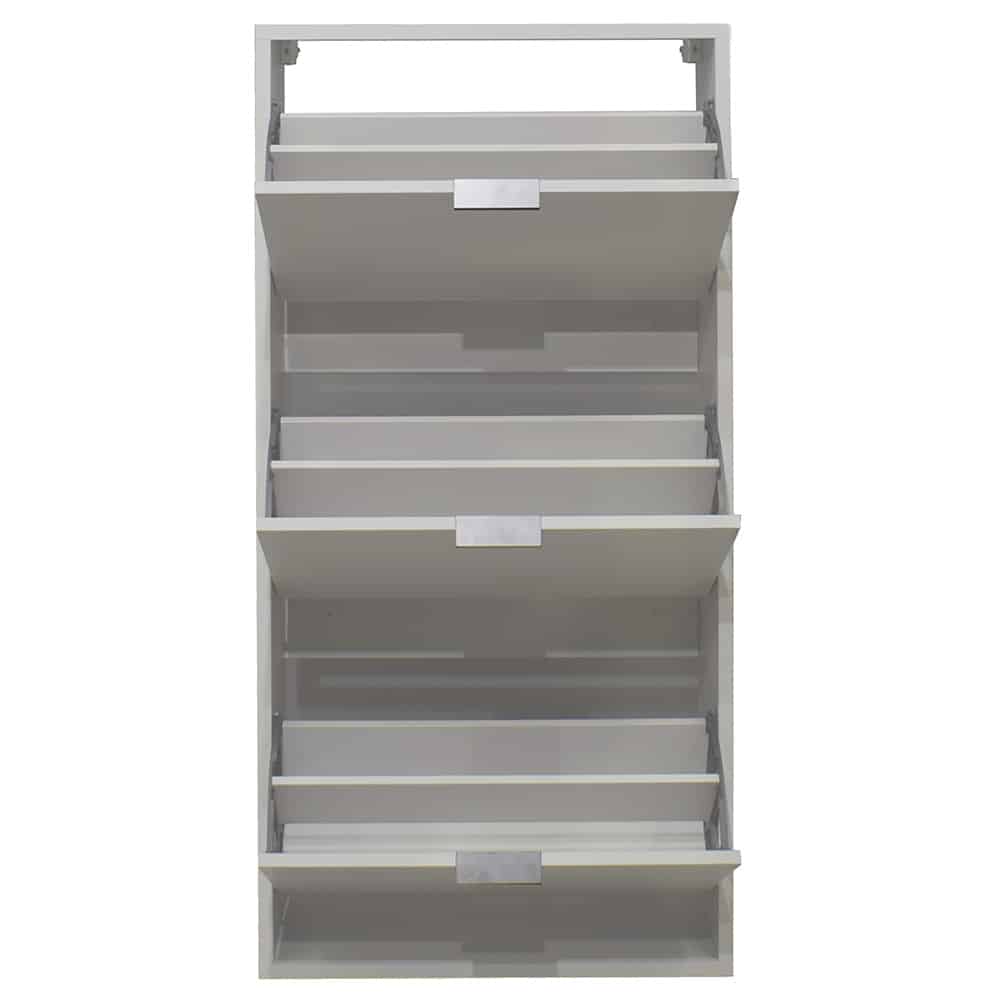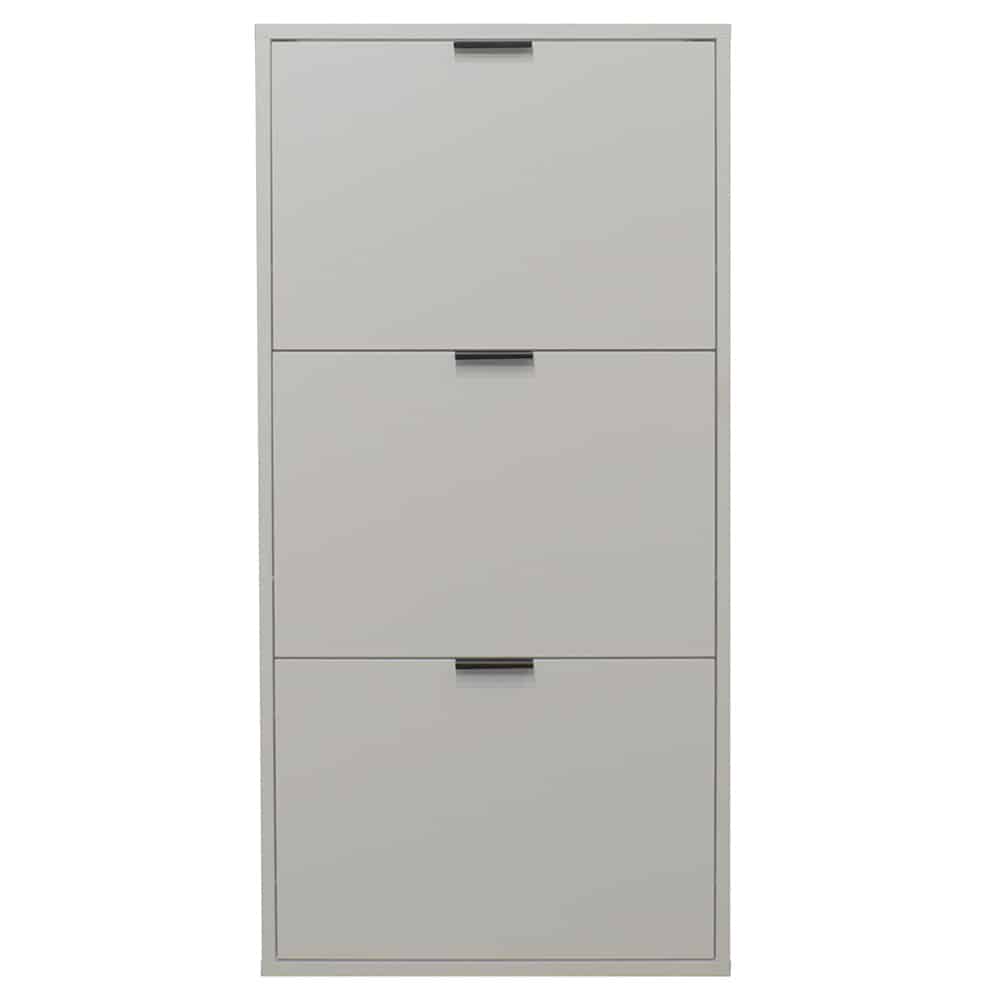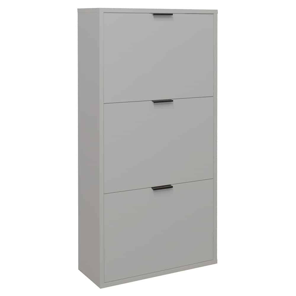 Der Schuhkipper Milana (ca. 61x126x25 cm) in Kreidegrau Matt Lack mit 3 Klappen und 2 Schuhwalzen bietet eine praktische und stilvolle Aufbewahrung für Ihre Schuhe.