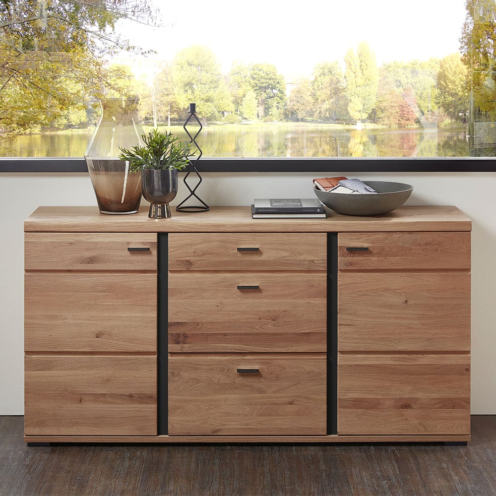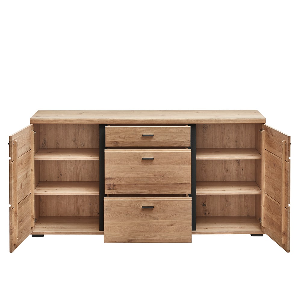 Das Sideboard Idusa Front Altesche massiv gebürstet überzeugt durch sein harmonisches Zusammenspiel von rustikalem Charme und modernem Design. Die Front aus gebürstetem Altesche-Massivholz verleiht dem Möbelstück eine natürliche, warme Optik und betont die hochwertige Verarbeitung. Akzentuiert wird das Holz durch schlanke Absetzungen in Schwarz matt, die für einen eleganten Kontrast sorgen. Mit einer Breite von ca. 170 cm bietet das Sideboard Idusa Front Altesche massiv gebürstet großzügigen Stauraum und Vielseitigkeit. Zwei Holztüren und drei Schubladen ermöglichen eine übersichtliche Aufbewahrung von Geschirr, Besteck, Dekoration oder anderen Utensilien. Die eleganten Griffe aus Metall in Schwarz matt sind sowohl funktional als auch stilvoll und passen perfekt zum Gesamtbild. Die stabilen Füße mit Kunststoffgleitern schützen den Boden und sorgen für einen sicheren Stand. Das Sideboard Idusa ist ein echter Blickfang in jedem Wohnzimmer, Esszimmer oder Flur und verbindet natürliche Materialien mit funktionaler Gestaltung. Es schafft eine freundliche Atmosphäre, bietet viel Platz und passt durch sein zeitloses Design in unterschiedlich eingerichtete Räume. Mit seiner Kombination aus rustikalem Holz, dunklen Akzenten und durchdachter Struktur ist es eine langlebige und stilvolle Ergänzung für dein Zuhause.