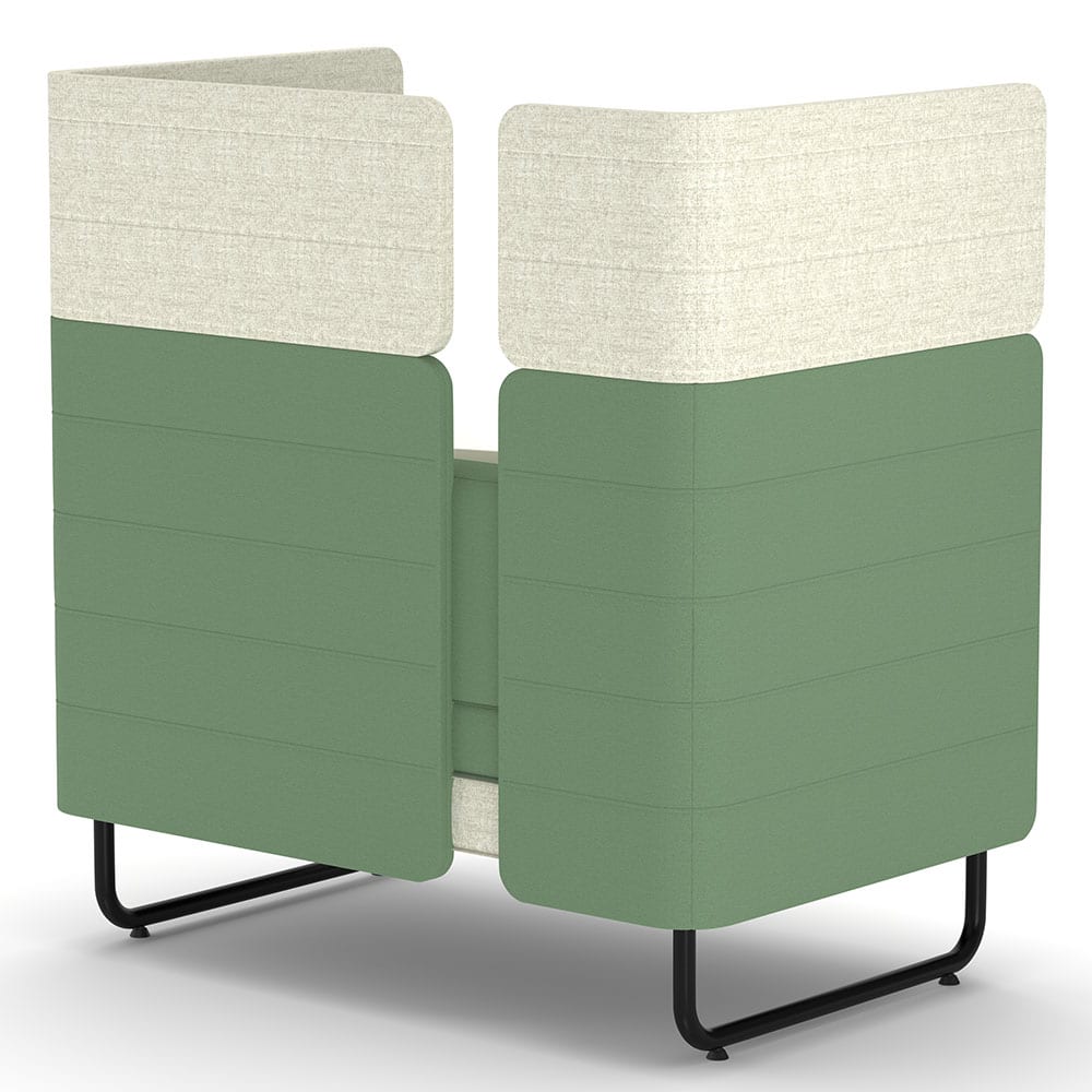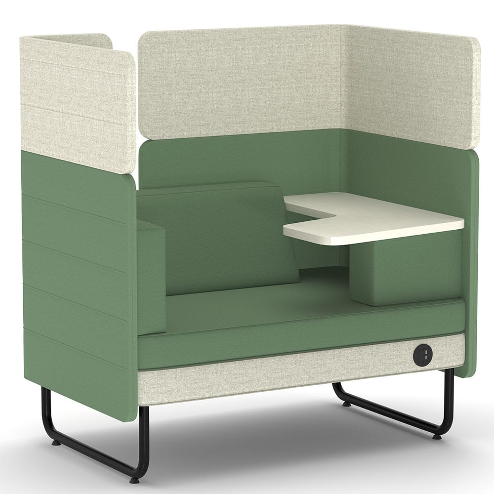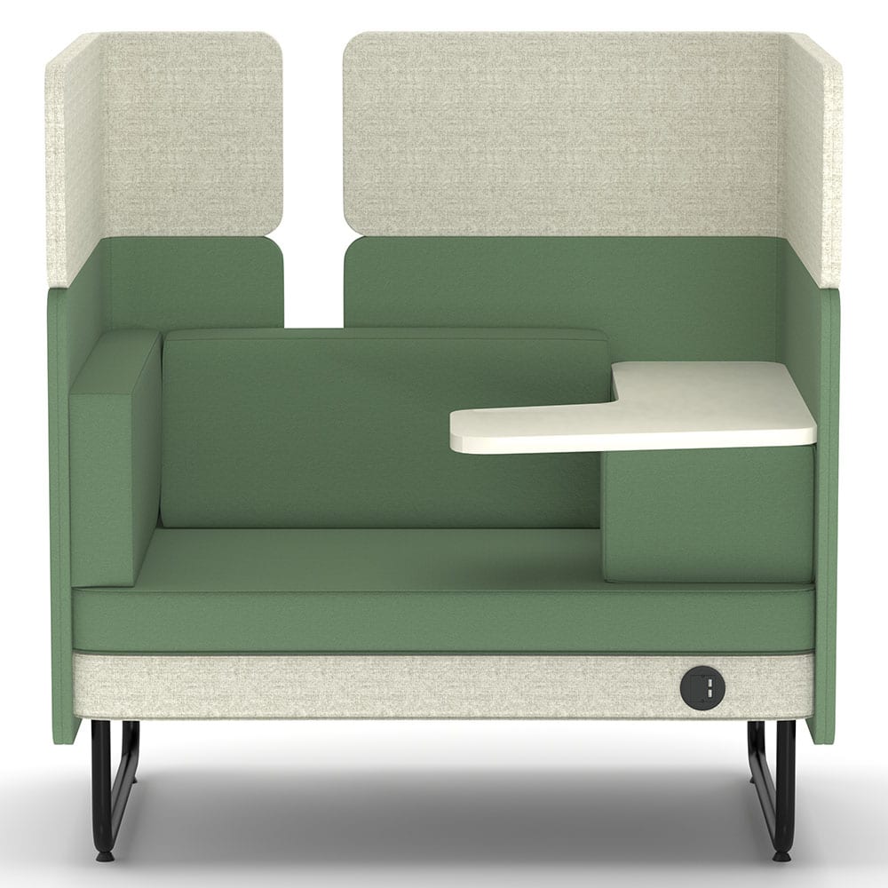 Ein praktischer Tisch in grau ergänzt das Möbelstück und bietet eine funktionale Ablagefläche für Arbeitsutensilien, Getränke oder persönliche Gegenstände. Durch die Kombination aus durchdachter Ausstattung, hochwertigen Materialien und modernem Design eignet sich das Sofa perfekt für kommunikative Zonen, Wartebereiche oder flexible Arbeitsumgebungen.