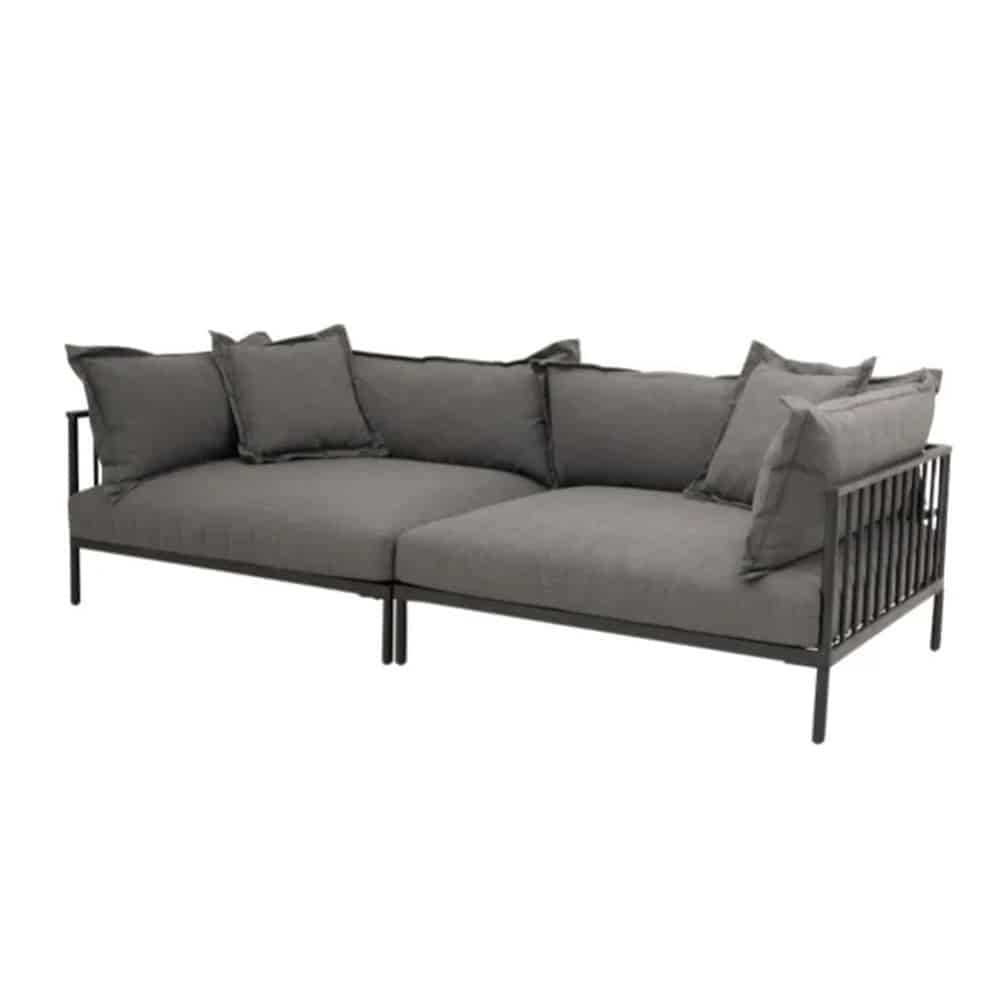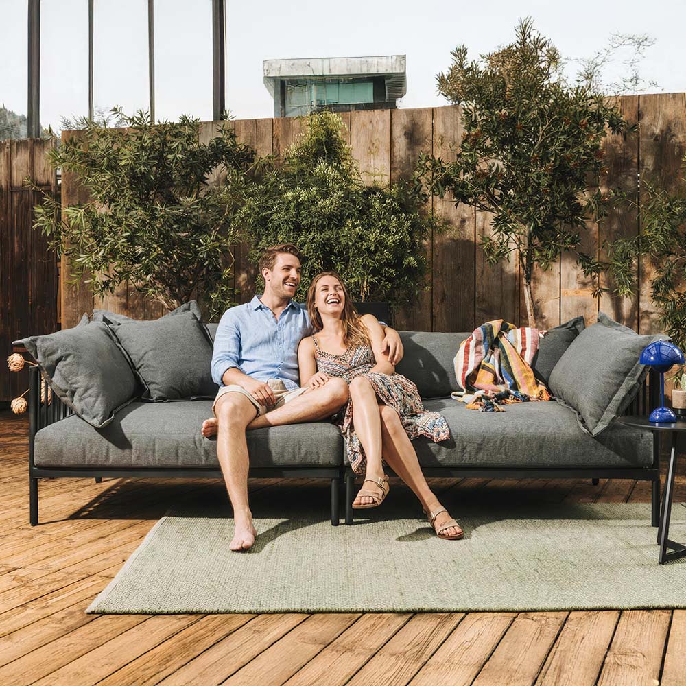 Das Gestell aus feuerverzinktem Stahl, matt schwarz pulverbeschichtet, sorgt für Stabilität, Langlebigkeit und eine moderne industrielle Optik. Die inkludierten Auflagen bieten zusätzlichen Komfort und machen das Sofa zu einem gemütlichen Platz für entspannte Stunden im Freien.