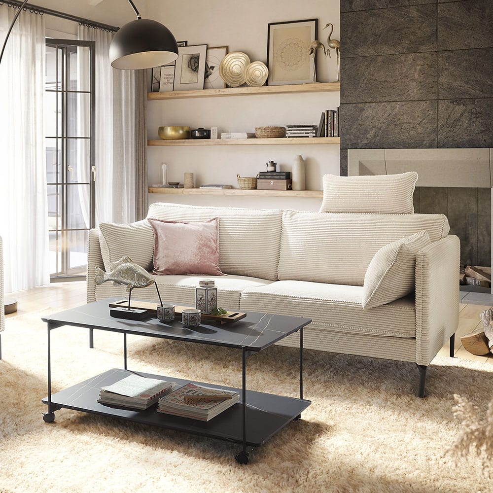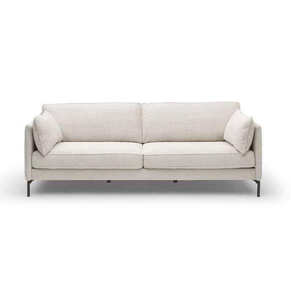 Das Sofa Broderik ist ca. 222 cm breit, mit Creme-Cord Bezug, Stahlwellenunterfederung und Schaumstoffpolsterung. Es bietet mit einer Sitzhöhe von ca. 41 cm, echt bezogener Rückenlehne, legere Polsterung und schwarzen Metallfüßen hohen Komfort und modernes Design.