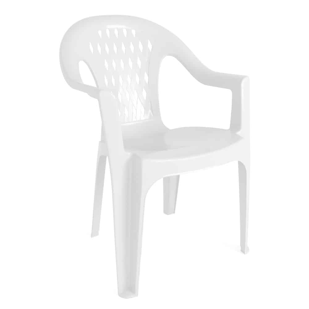 Der Stapelstuhl Tressi aus weißem Kunststoff ist leicht, pflegeleicht und platzsparend stapelbar – ideal für Garten, Balkon oder Terrasse.