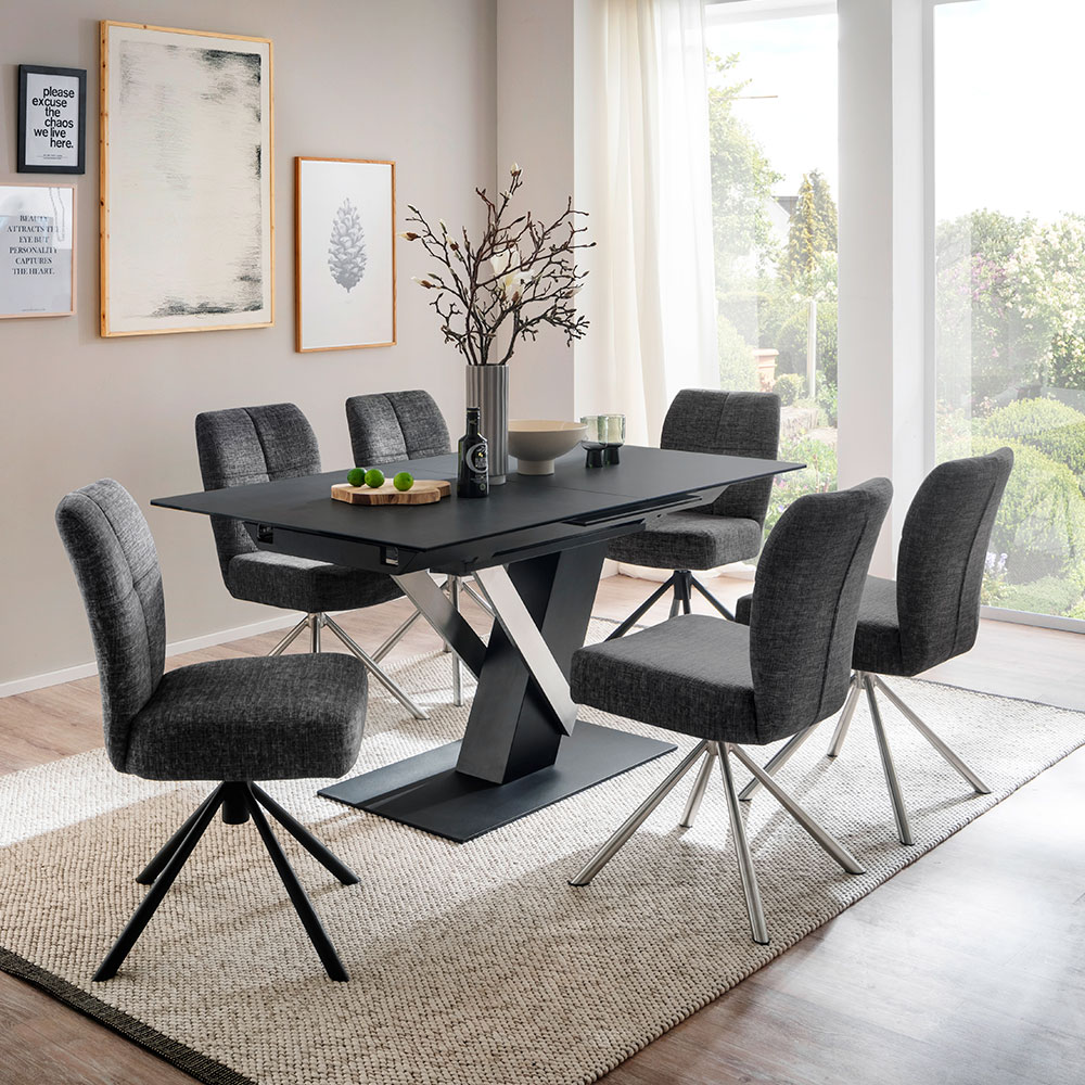 Der Stuhl Buzau (ca. 48x88x61 cm) kombiniert modernes Design mit hohem Sitzkomfort. Mit anthrazitfarbenem Bezug, schwarzem Gestell und 360°-Drehfunktion ist er vielseitig und stilvoll.