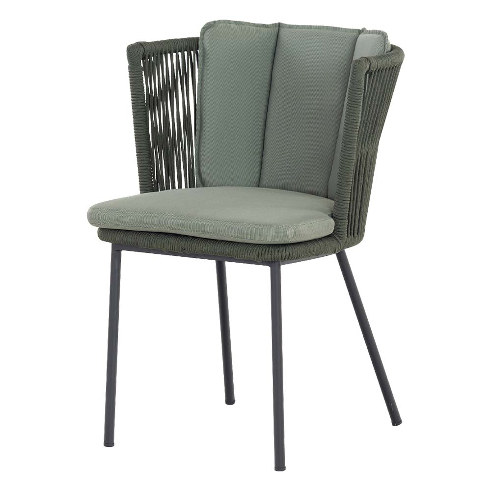 Der Stuhl Tessa überzeugt durch sein modernes Design und hochwertige Materialien, die ihn zu einer stilvollen Sitzgelegenheit für Terrasse, Balkon oder Garten machen. Die Rücken- und Seitenflächen aus rundem Rope-Geflecht in Grün verleihen dem Stuhl eine elegante, luftige Optik und sorgen gleichzeitig für angenehmen Sitzkomfort.