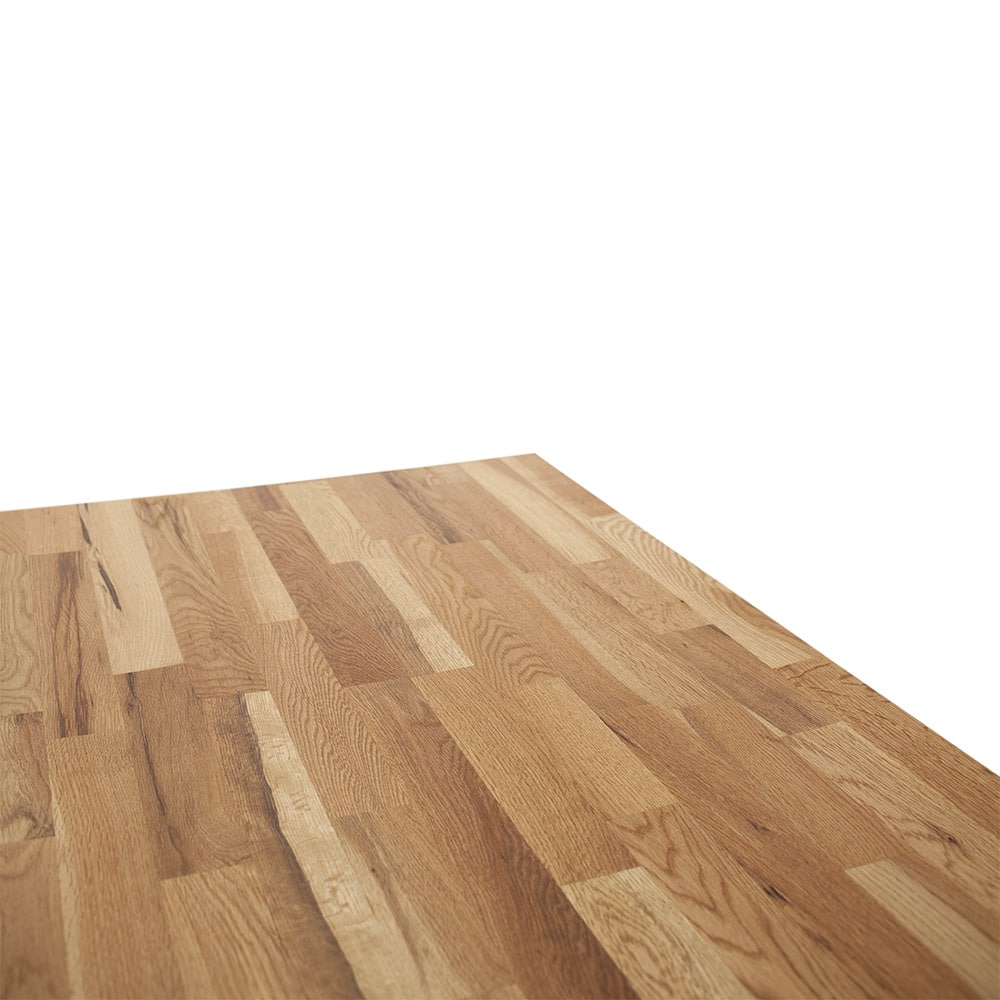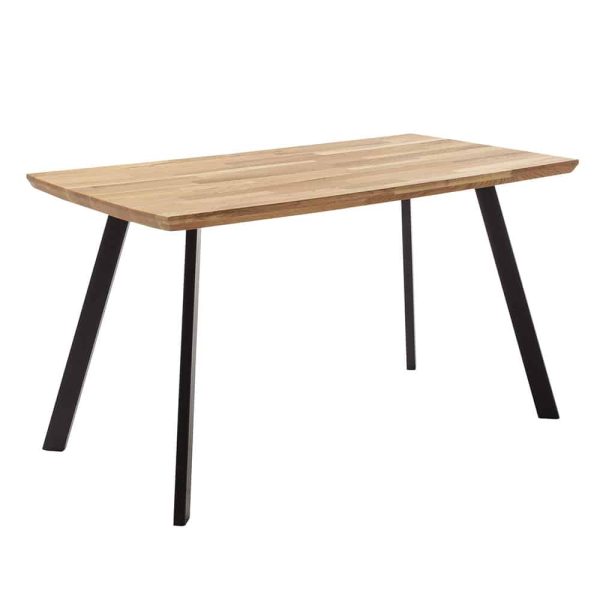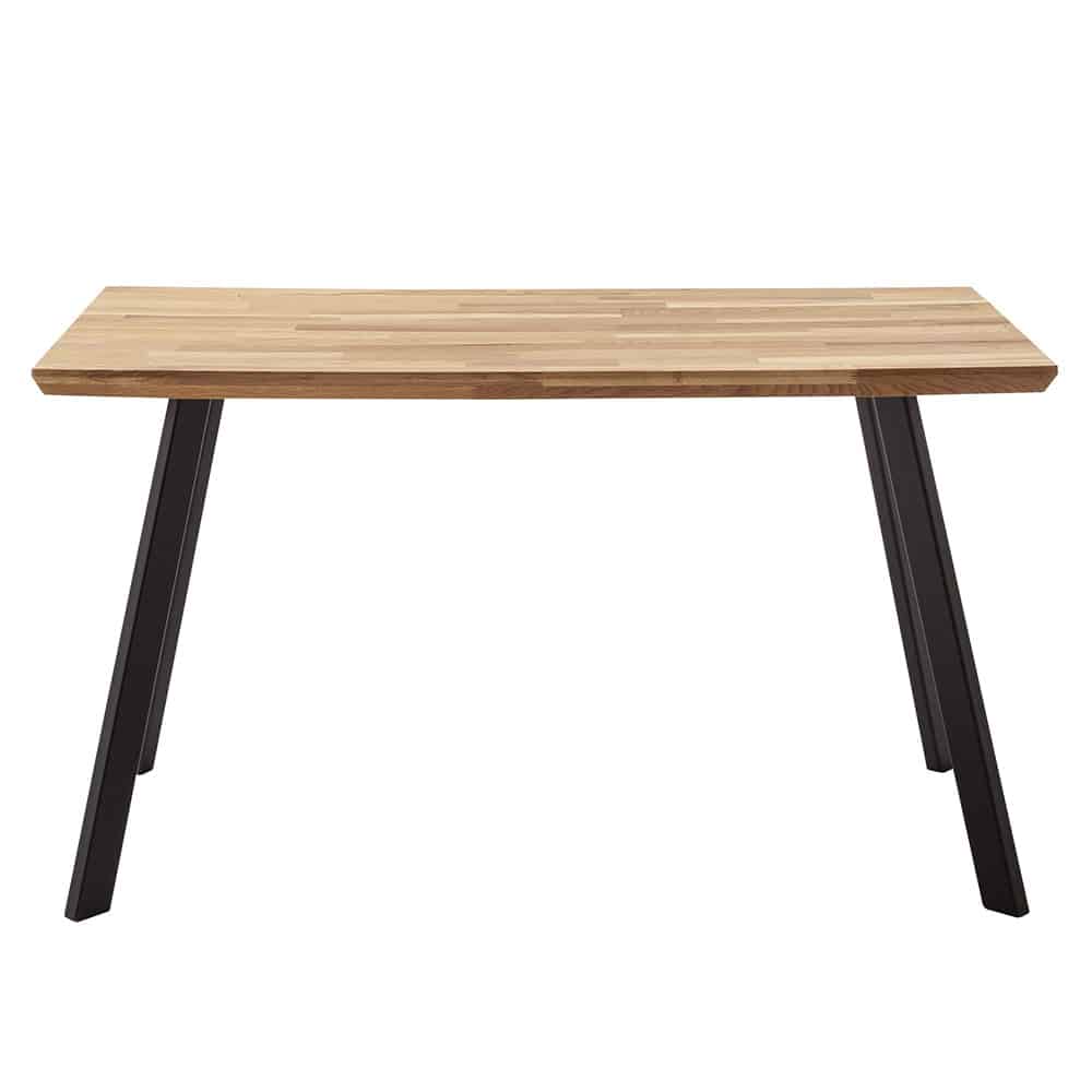 Der Tisch Zamora (ca. 120x81x75 cm) überzeugt mit einer geölten, keilgezinkten Zerreicheplatte, einer stilvollen Schweizer Kante und einem stabilen schwarzen Metallgestell. Perfekt für ein modernes Zuhause!