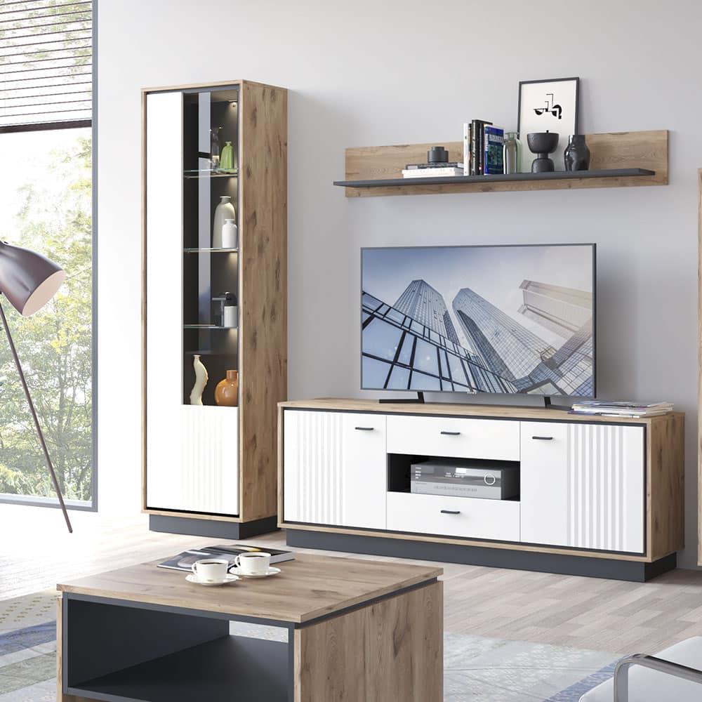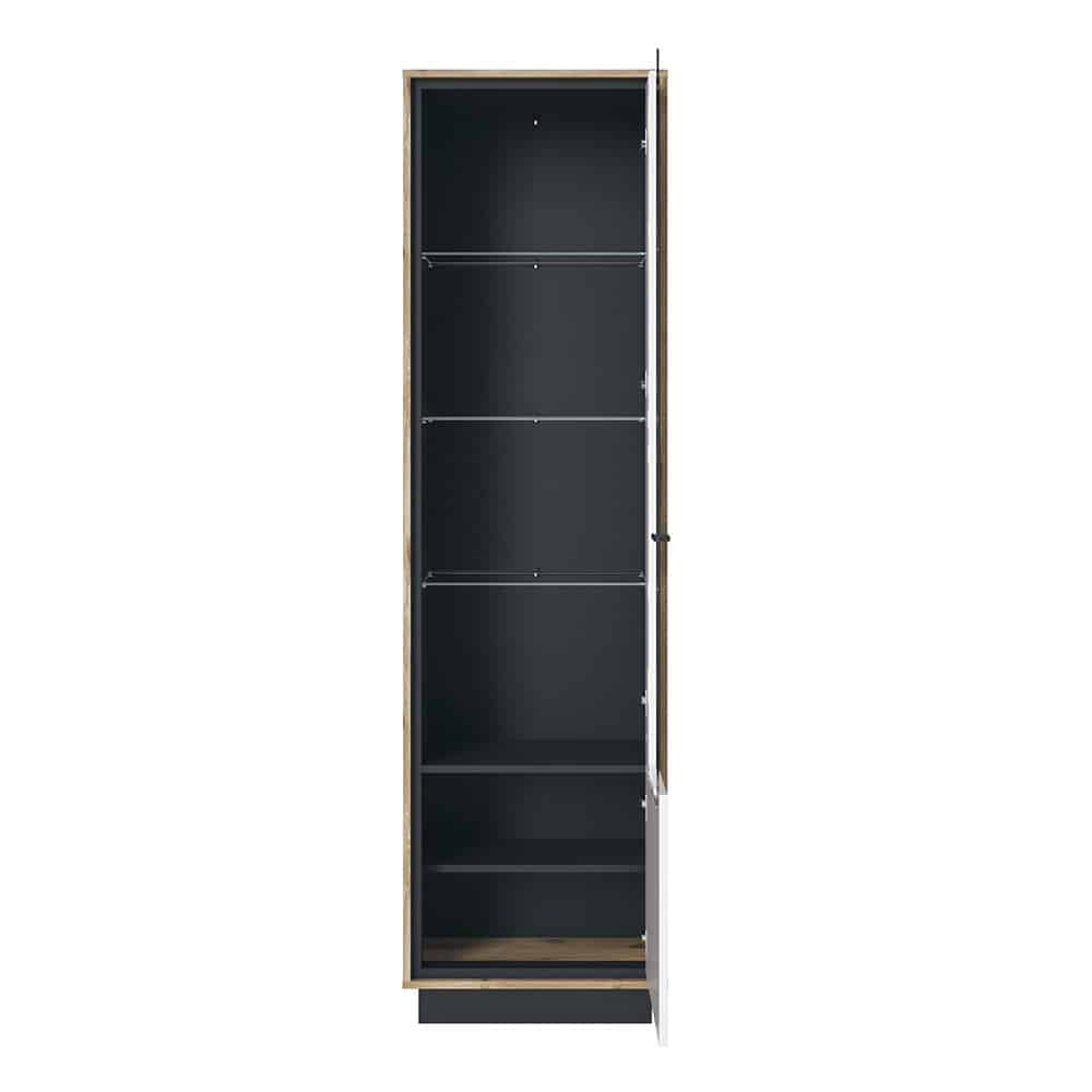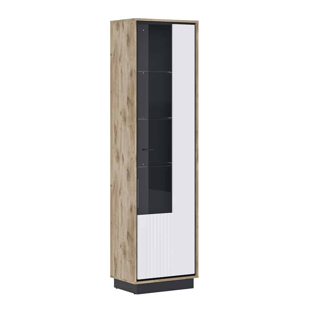 Vitrine Windor (ca. 57x207x37 cm) in Viking Eiche perlschwarz Dekor und Front in Hochglanz weiß mit Stangengriff schwarz