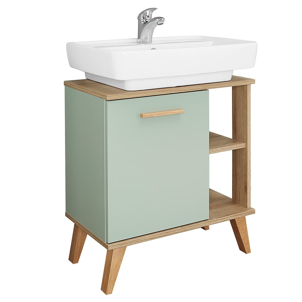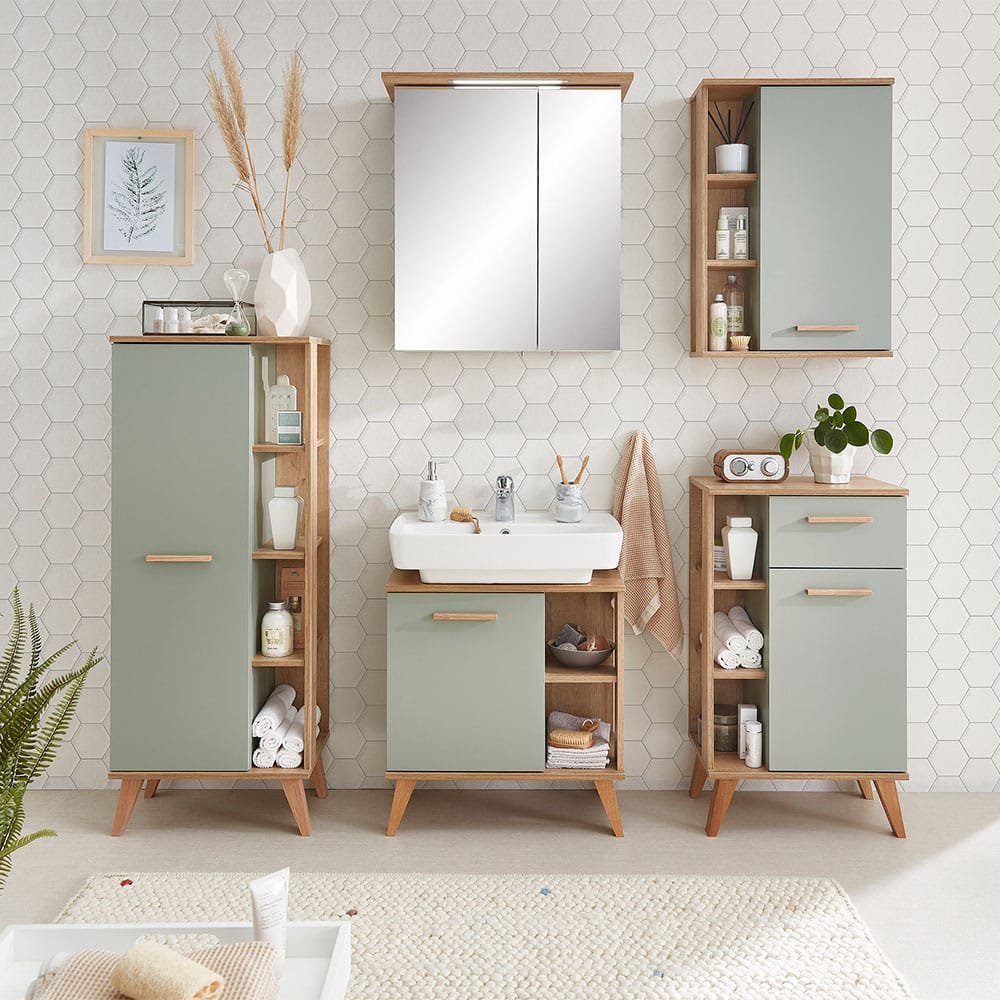Waschbeckenunterschrank salbei – moderner Stauraumklassiker mit sanftem Salbeigrün und Riviera-Eiche.