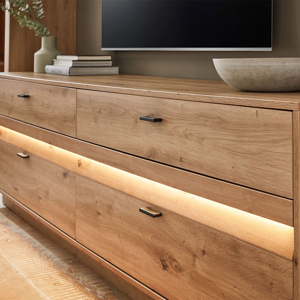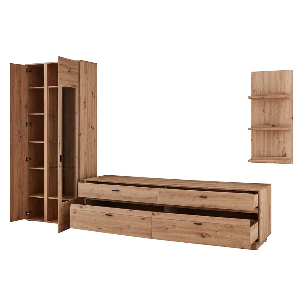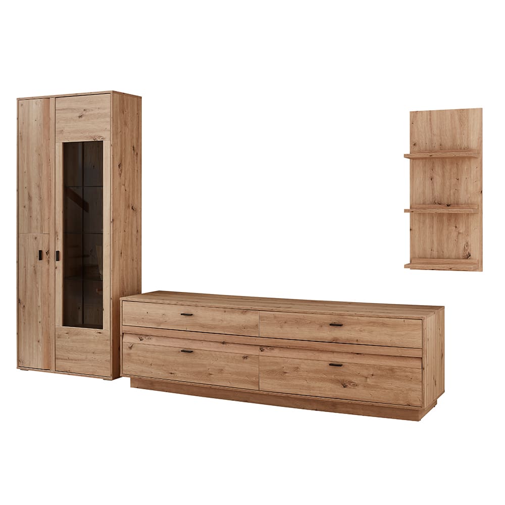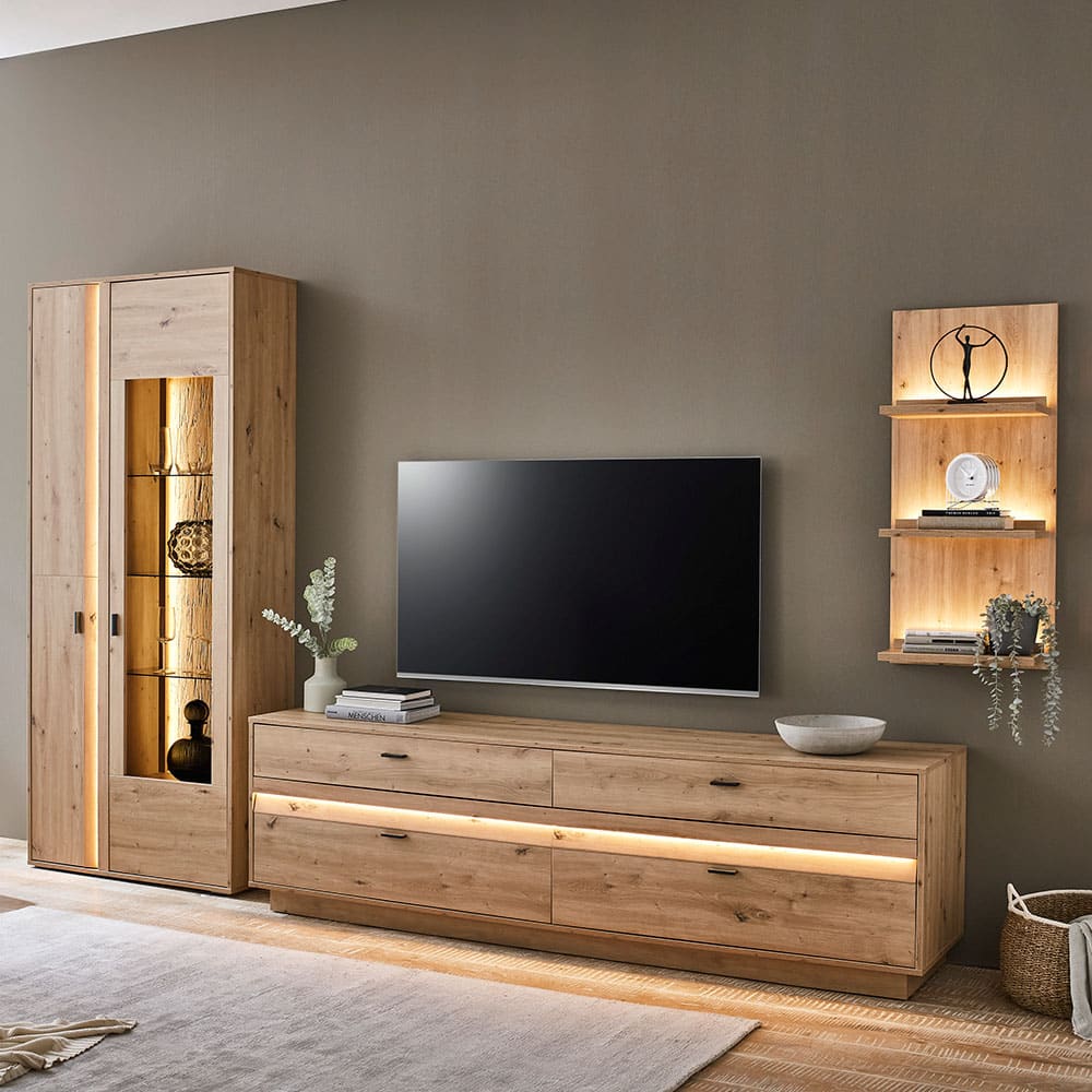 Wohnkombination Benito braun in Eiche Artisan mit Beleuchtung. Mit Vitrine, Lowboard und Regal – praktisch und atmosphärisch zugleich.