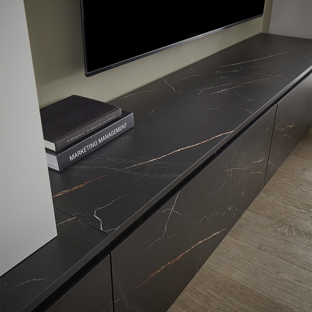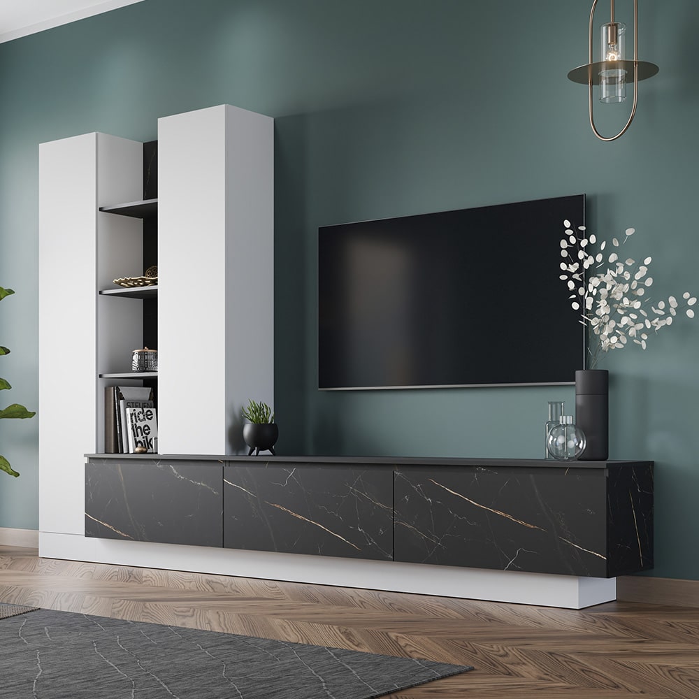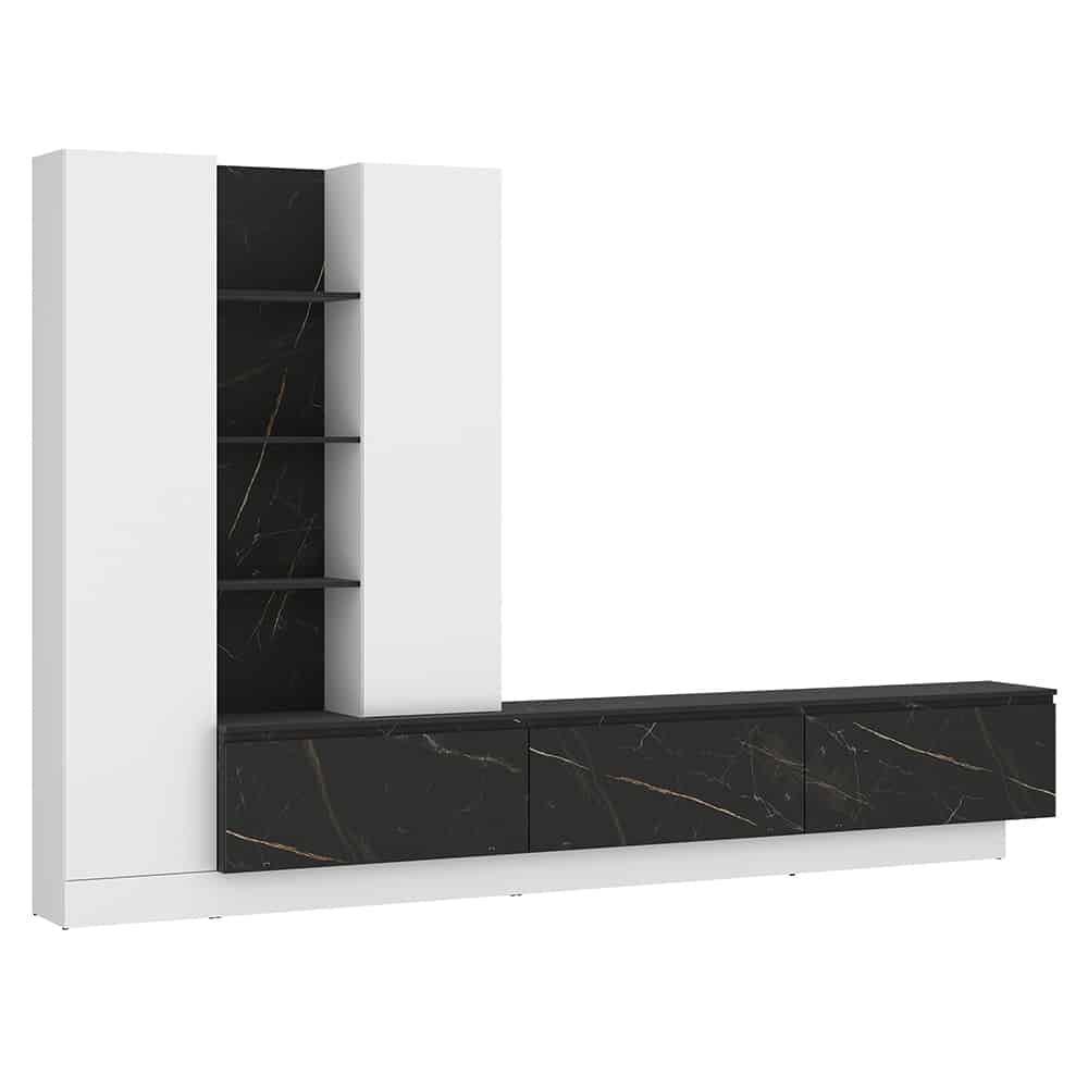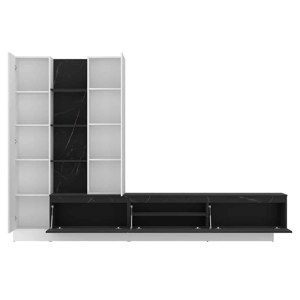 Die Wohnwand Morana (ca. 295x201x40 cm) in Alpinweiß ist grifflos und modern gestaltet, mit einer stilvollen Absetzung in Keramikoptik – perfekt für ein elegantes Wohnzimmer.
