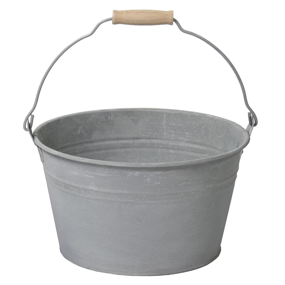 Vielseitiger Zinkeimer silber mit stabilem Holzgriff. Ideal als Deko, Pflanzgefäß oder Ordnungshelfer. Maße: Ø 16 x H 14 cm.
